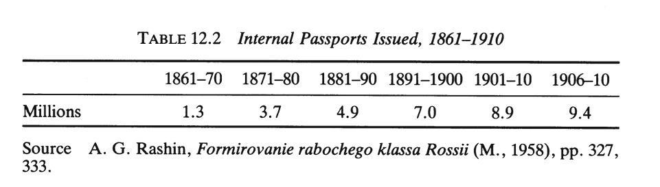 И, вопреки предположениям о том, что крестьяне в России столкнулись с географической невозможностью расширять далее возделываемые земли, работы советских историков демонстрируют не только значительное расширение посевных площадей с 1861 по 1913 год, но и последующее удвоение площади сельскохозяйственных земель с 1913 года (по 1986 год). Как показали исследования советских историков, возросшая власть сельской общины (после 1861 года) не стала препятствием для резкого увеличения крестьянской мобильности, о чём свидетельствуют количество «внутренних паспортов», выдаваемых крестьянам в год (см. таблицу 12.2)….