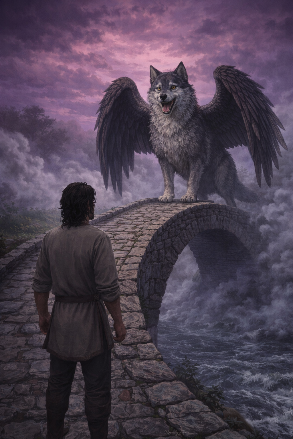 Следующая иллюстрация чату GPT удалась безупречно с первого раза. На мой взгляд, это отличная иллюстрация того, как я представлял встречу на Калиновом мосту (одна из последний глав первой части романа) и саму обстановку перехода в загробный мир. По-моему, это вообще лучшее изображение перехода в загробный мир, во всяком случае, меня очень впечатляет каждая деталь.