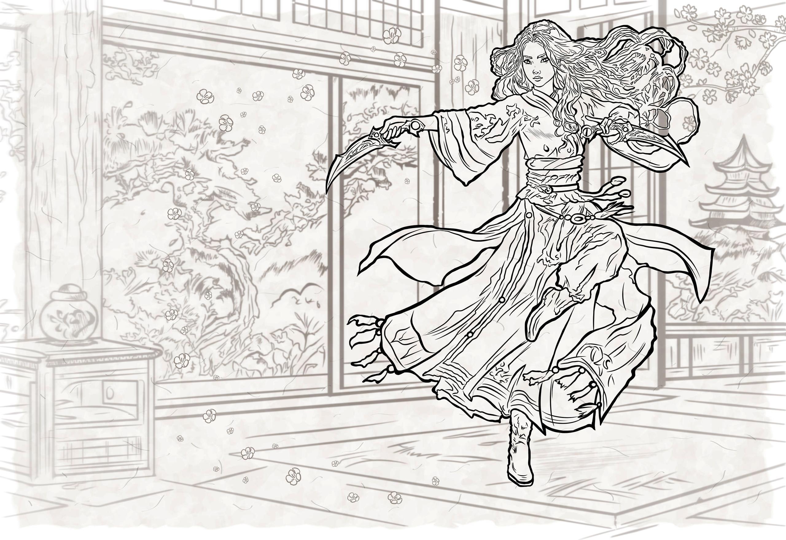 Наташа Гудожникова подарила мне проиллюстрированную сцену, когда Элирия экстренно выдумывает и соединяет женский танец с веерами с эльфийскими клинками и показывает при дворе Аккрийских нечто новое :)