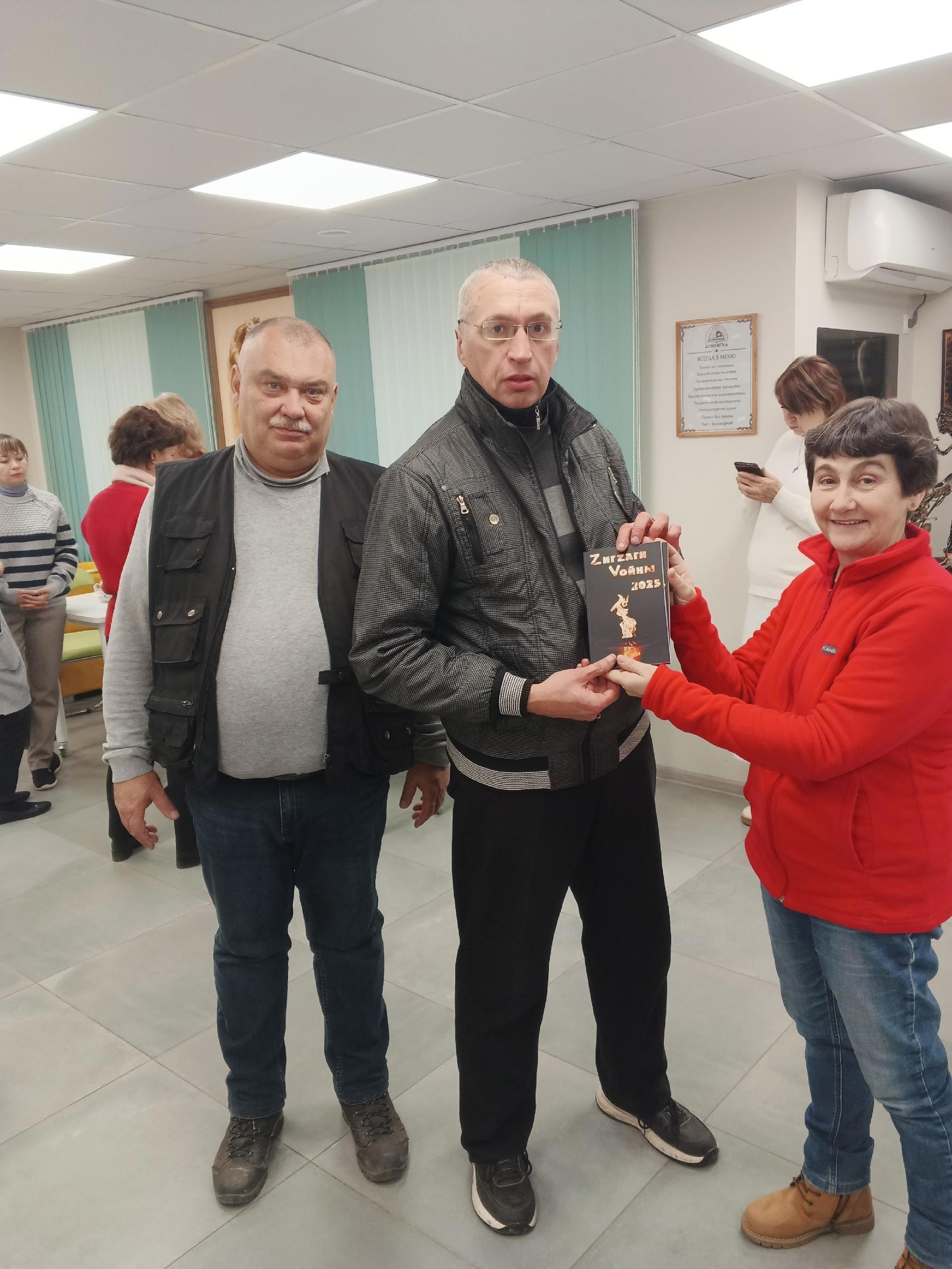 Вручили книгу Саше Русскому. Это третий выпуск сборника "Zигзаги Vойны - 2025". Здесь напечатан трагичный и пронзительный рассказ Саши Русского "Умочка"
