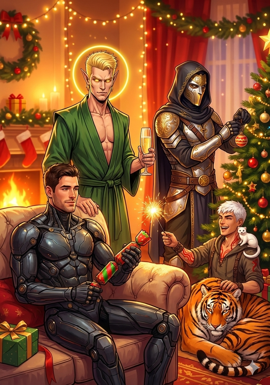 На первой фотографии Дану в зеленом халатике в представлении не нуждается! Слева в крутом костюмчике сидит Максим, из цикла "Первый пользователь", а елку наряжает Маэстро из Хроник геноцида, авторства Михаила Злобина, на чьи произведения я сделал уже пару рецензий. Ну и рядом с тигром сидит Егерь из Системного зверолова, что в последнее время рвет Топы.