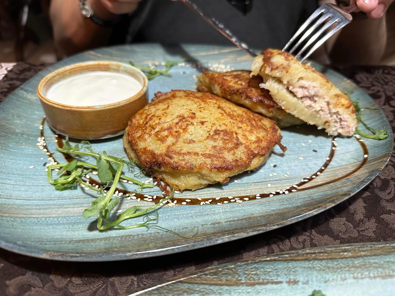 В Беларуси - нашли самые вкусные драники. Называются "Колдуны" с мясом. Подают в ресторане в Мирском замке. Я на Беларусь все еще немного зол за её вчерашний, прости господи, "абсент", не получается он у них, но с картошкой они работать умеют как никто другой.