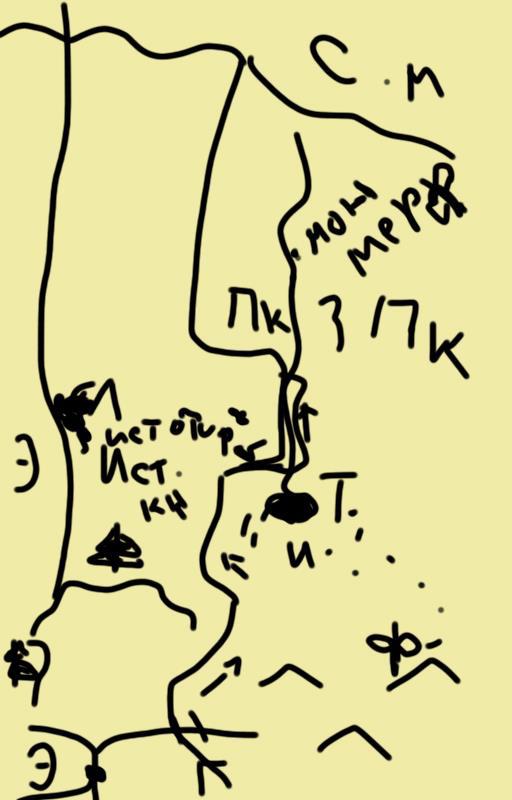 Если что, самая нижняя жирная точка -- это тот самый трактир на Яростной Стремнине, от которого расходятся дороги. Стрелочками обозначено направление течения Яростной Стремнины. Буква З -- это Заснеженная, река, которая течет в Студеное море. Буква Ф -- обозначение Феллбергена. От него пунктиром обозначена дорога в Таримию. А остальное, может, угадаете сами?