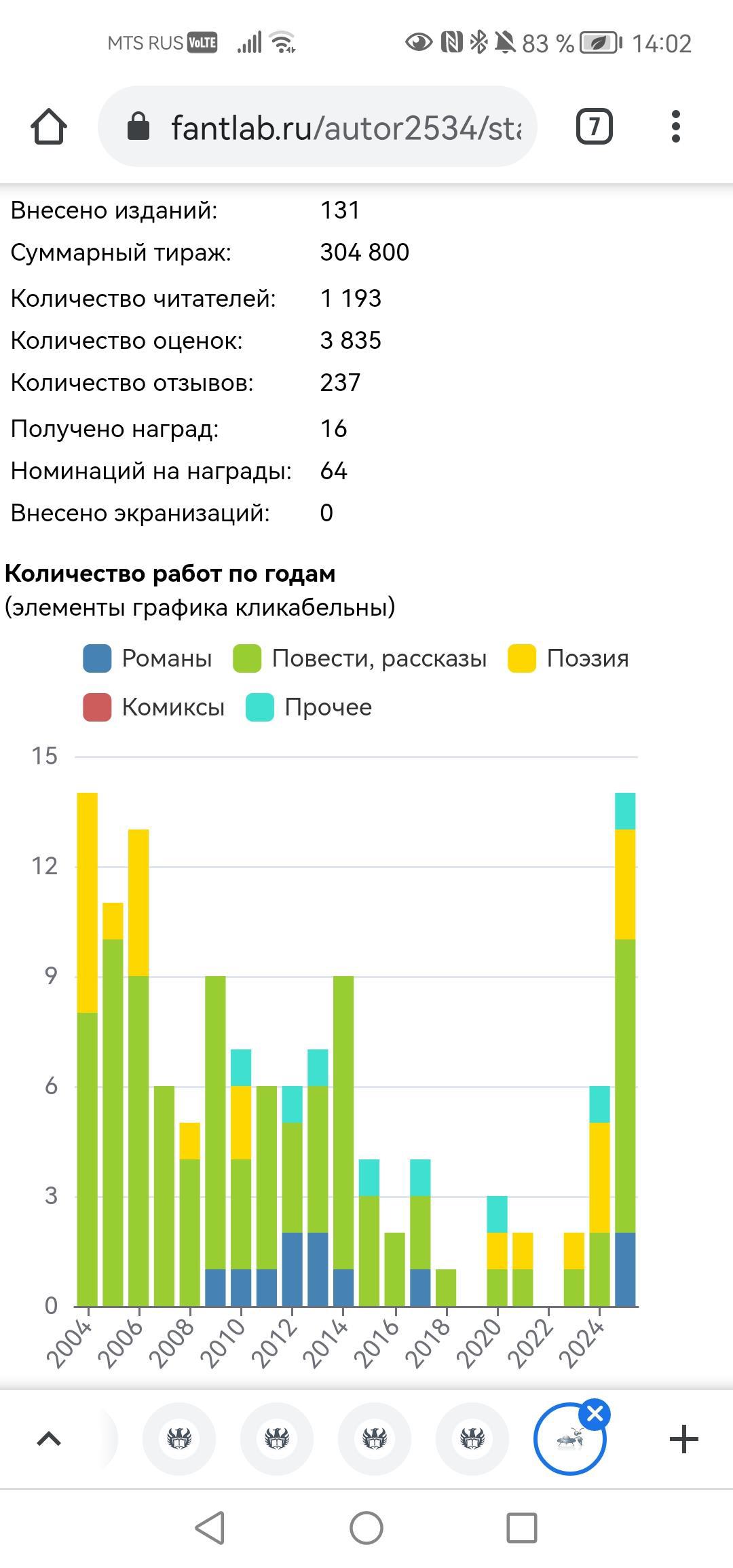 Автор: Зонис Юлия АлександровнаНа самом деле один показательный график с Фантлаба. По нему ясно видно, что с 14 года у меня писательская пауза длиной в 10 лет (публиковались в этом промежутке в основном старые рассказы), в 2024 началось возрождение, в 2025 - выход на рекорды 2004-2006 года. Думаю, повторить в этом году не удастся, ну хотя бы не уронить опять в ноль хотелось бы. Ещё раз всех с Новым Годом!