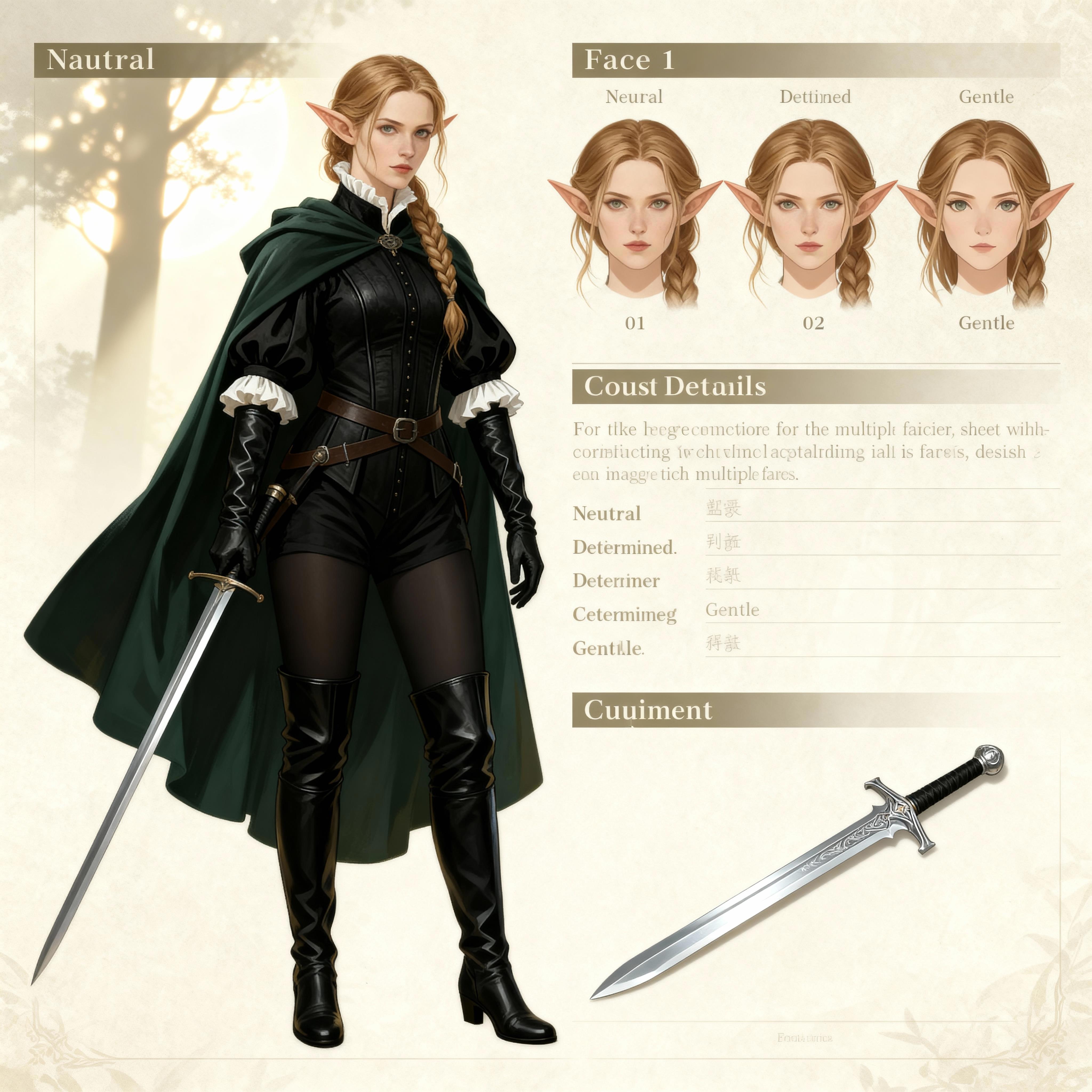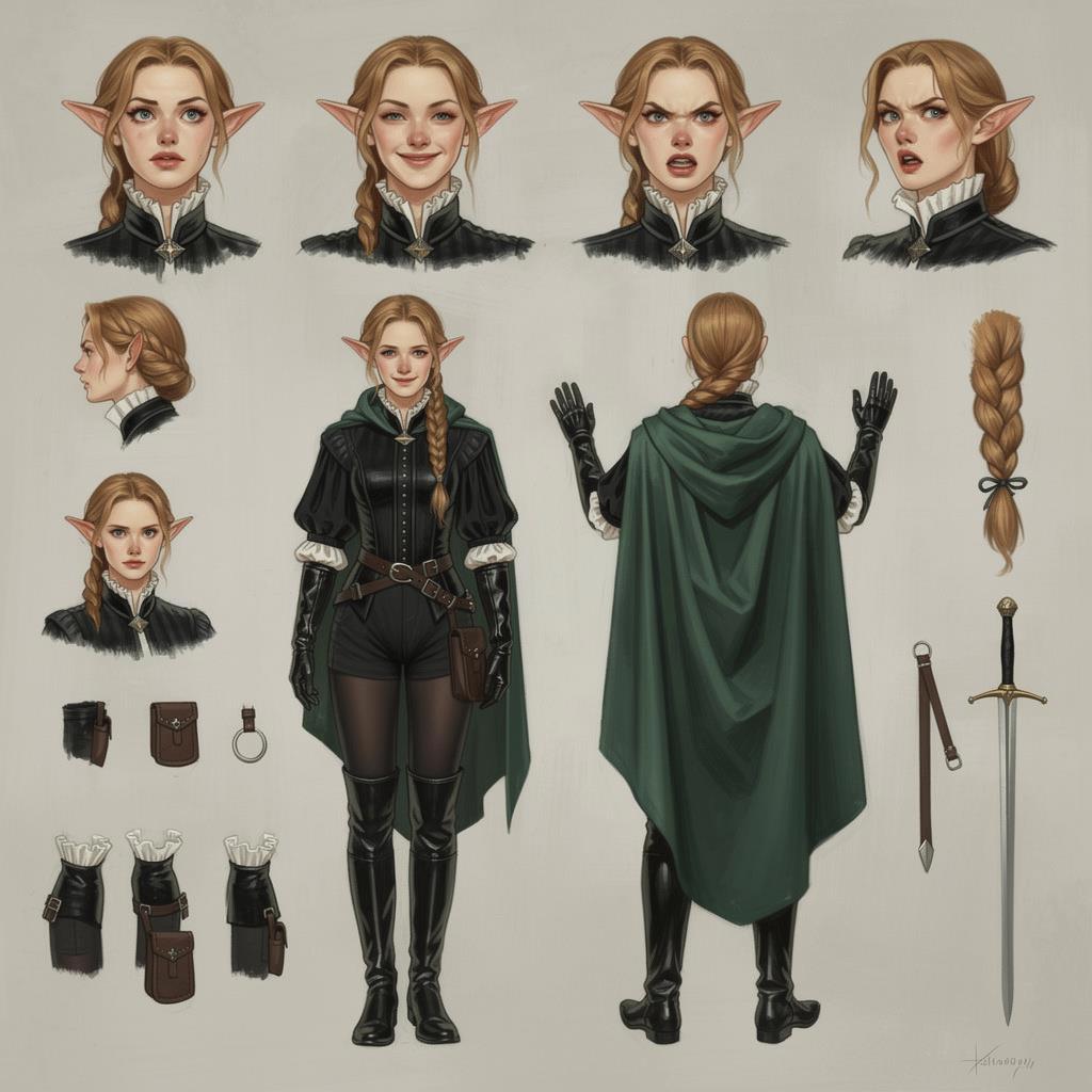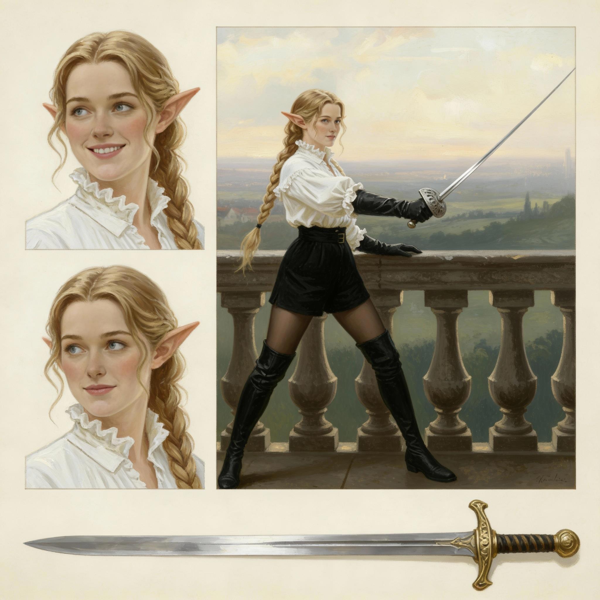 Автор: Руслан БирюшевВ честь дня рожденья повозился ещё с новой находкой, погенерировав в нейросетках листы персонажей - и на сей раз выбрал объектом для экспериментов Кинн, эльфийку-фехтовальщицу из будущей свиты Розы Гранчи. Получилось на удивление здорово, и образ ушастой мечницы прямо-таки полон харизмы тут, как мне кажется ^_^