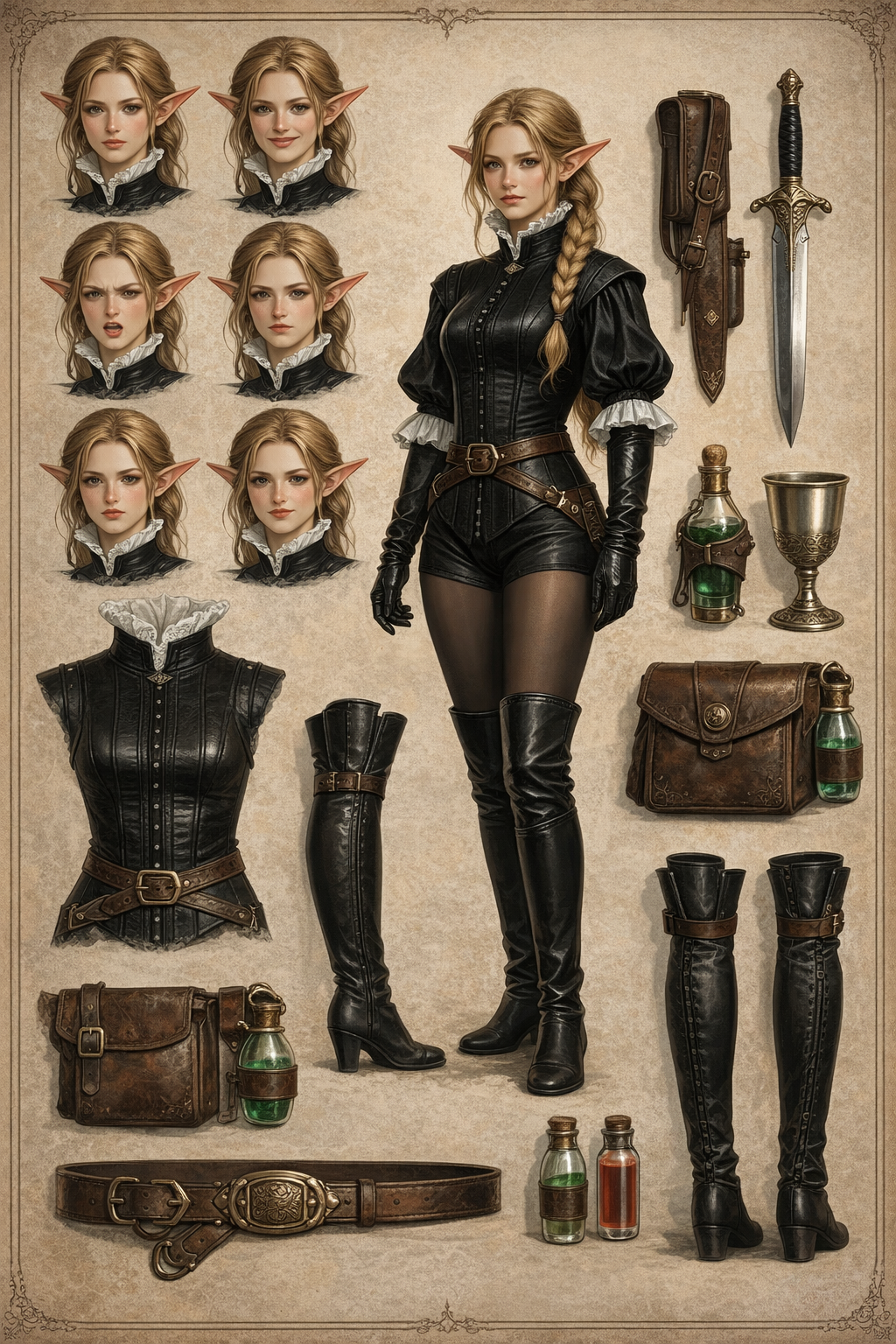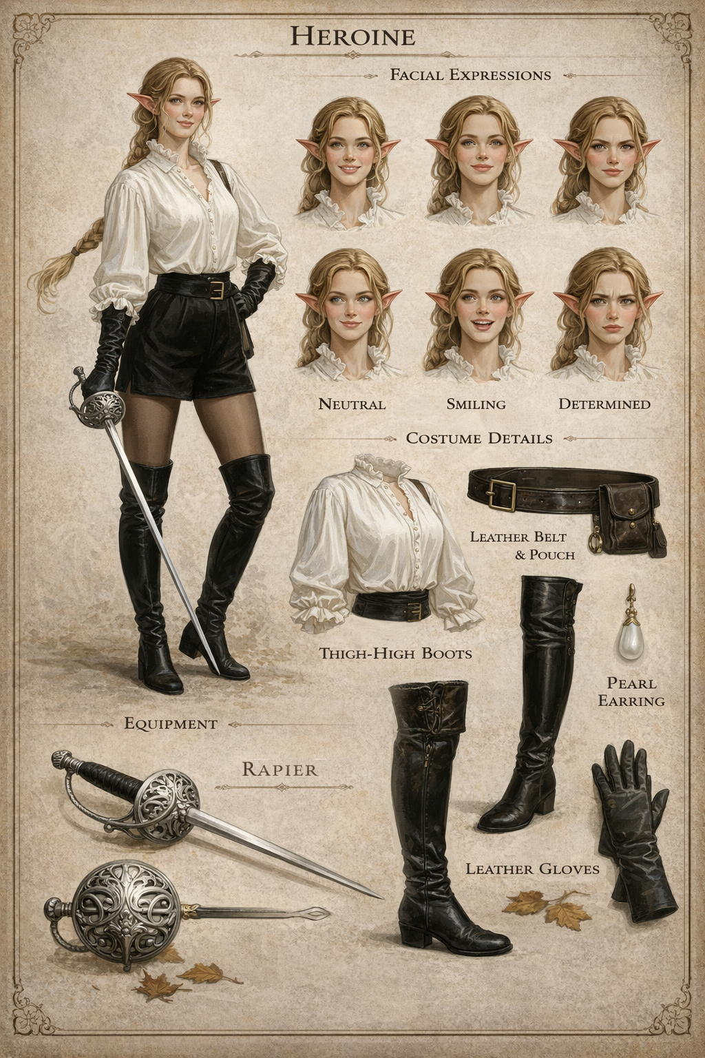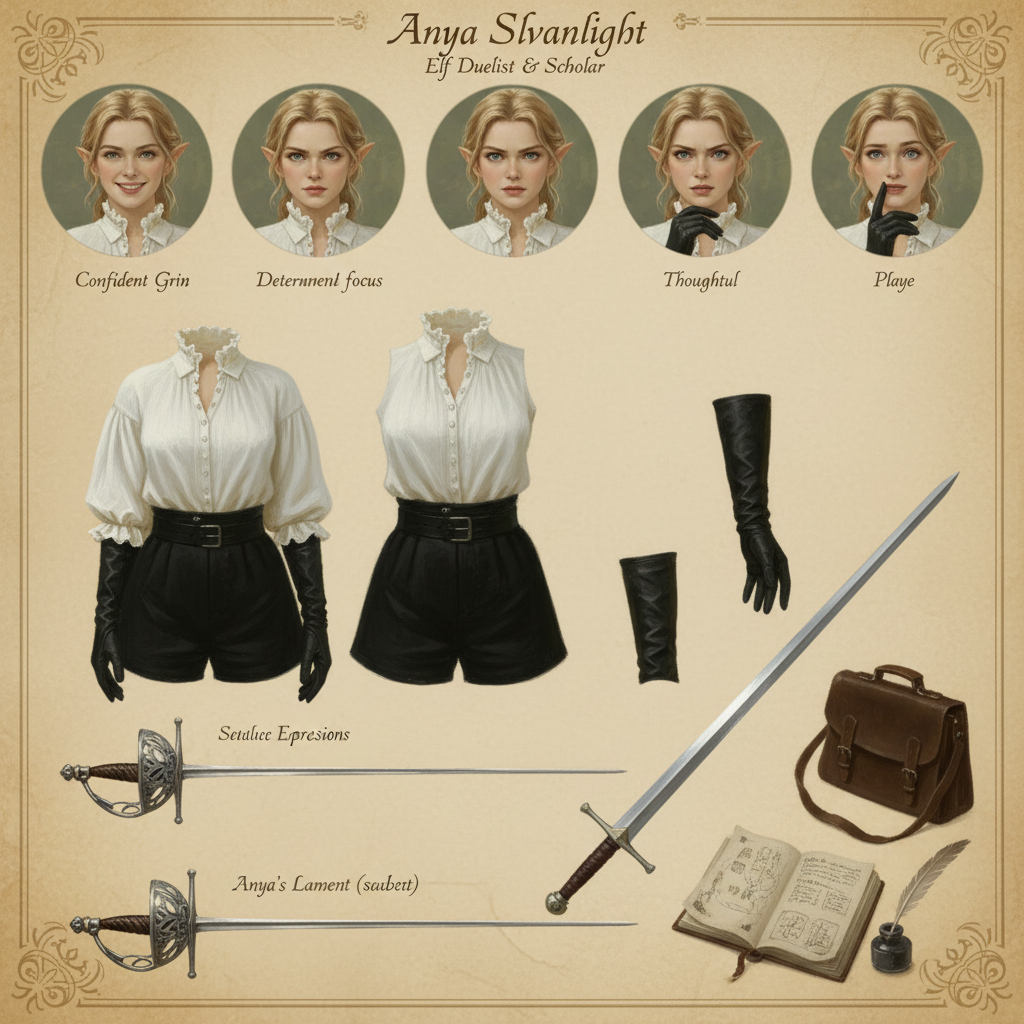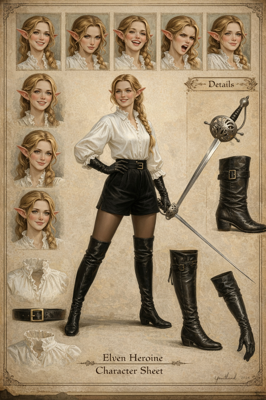 Автор: Руслан БирюшевВ честь дня рожденья повозился ещё с новой находкой, погенерировав в нейросетках листы персонажей - и на сей раз выбрал объектом для экспериментов Кинн, эльфийку-фехтовальщицу из будущей свиты Розы Гранчи. Получилось на удивление здорово, и образ ушастой мечницы прямо-таки полон харизмы тут, как мне кажется ^_^