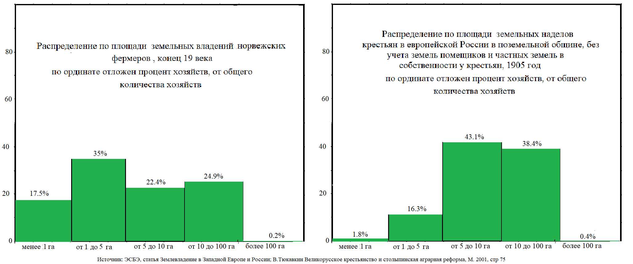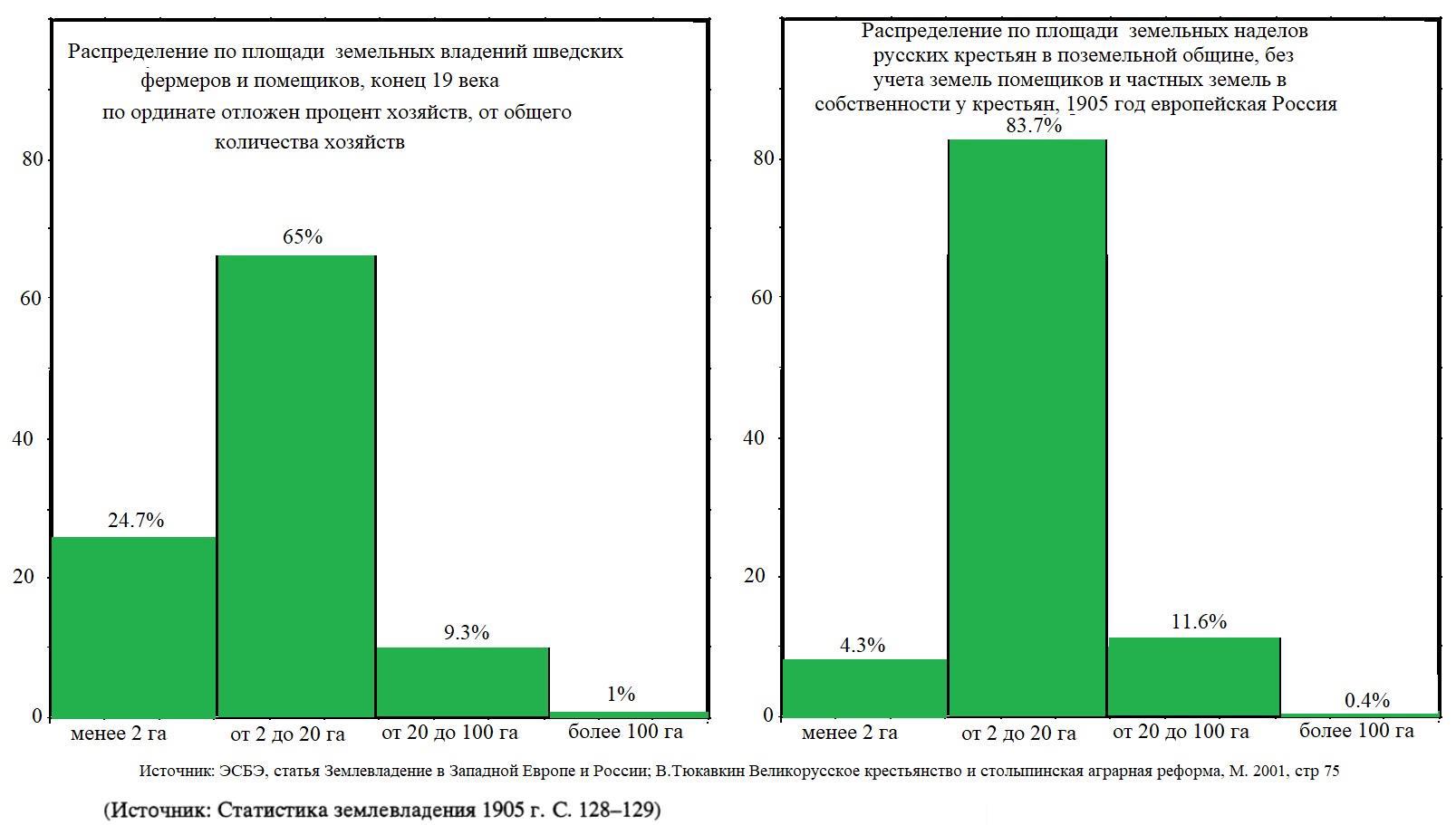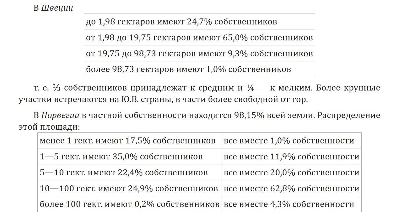 Сравнение с другими странами принимает совсем карикатурный характер (данные по европейским странам из ЭСБЭ статья статья Землевладение в Западной Европе и России). В Дании "до 6,6 гект. земли имели 99,1% собственников (из них до 0,55 гект. — 64,3%). Более крупные составляют ничтожную группу, менее 1%".
