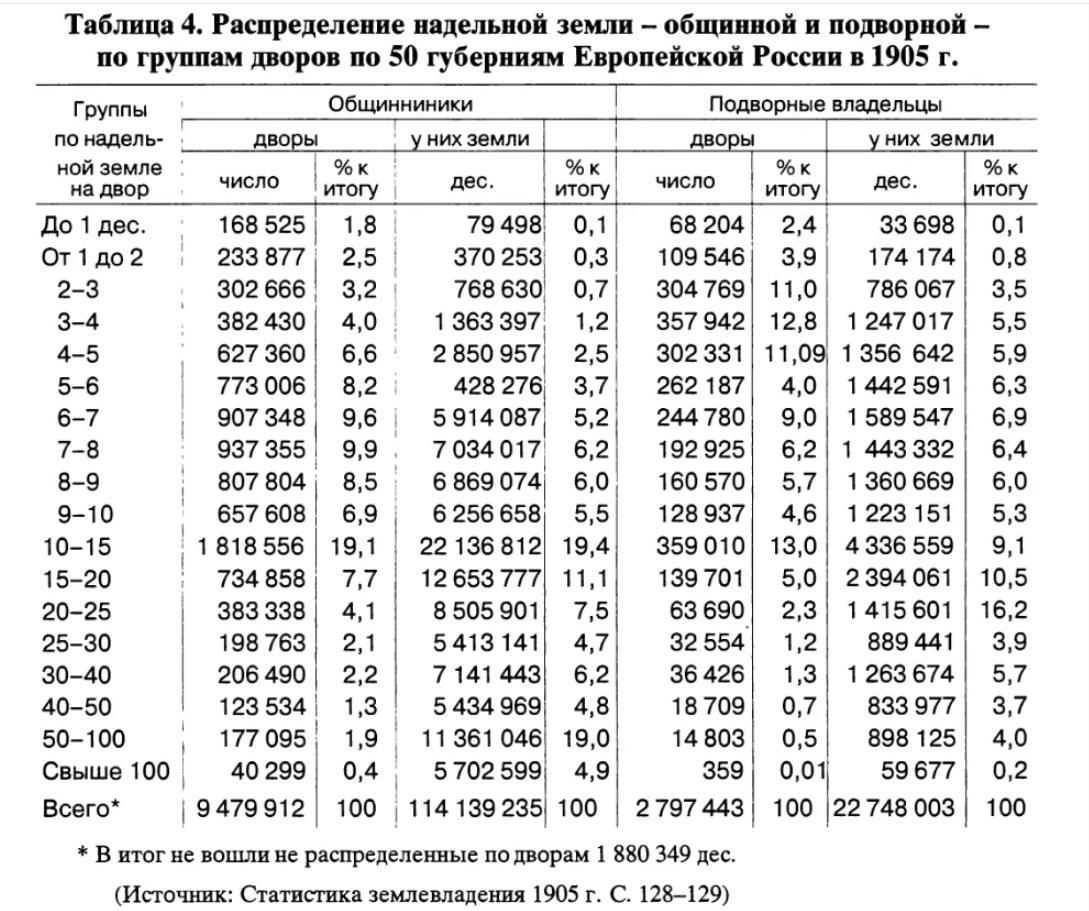 Полная таблица площади крестьянских хозяйств европейской России (без учета 20 млн. десятин частной земли в собственности крестьян). Десятина это 1.1 га.