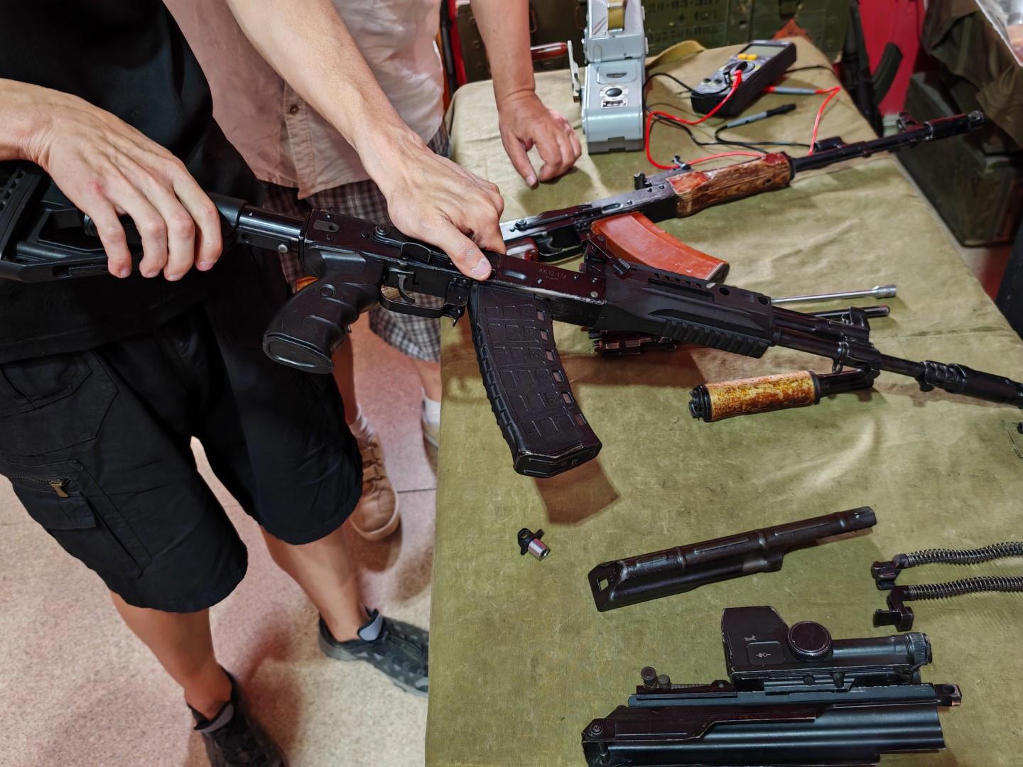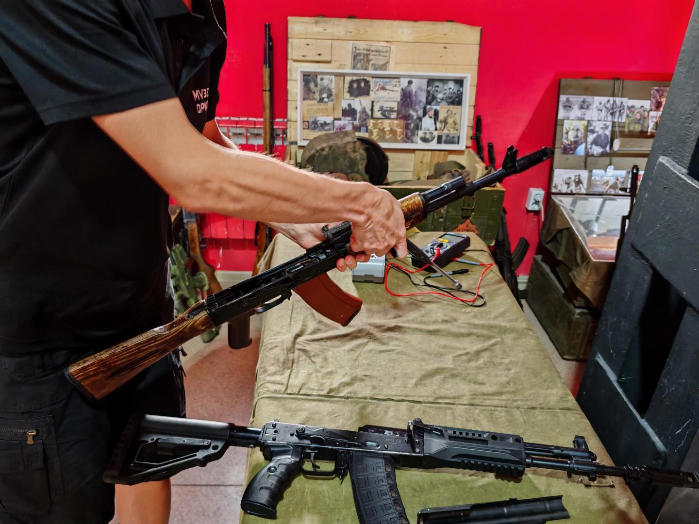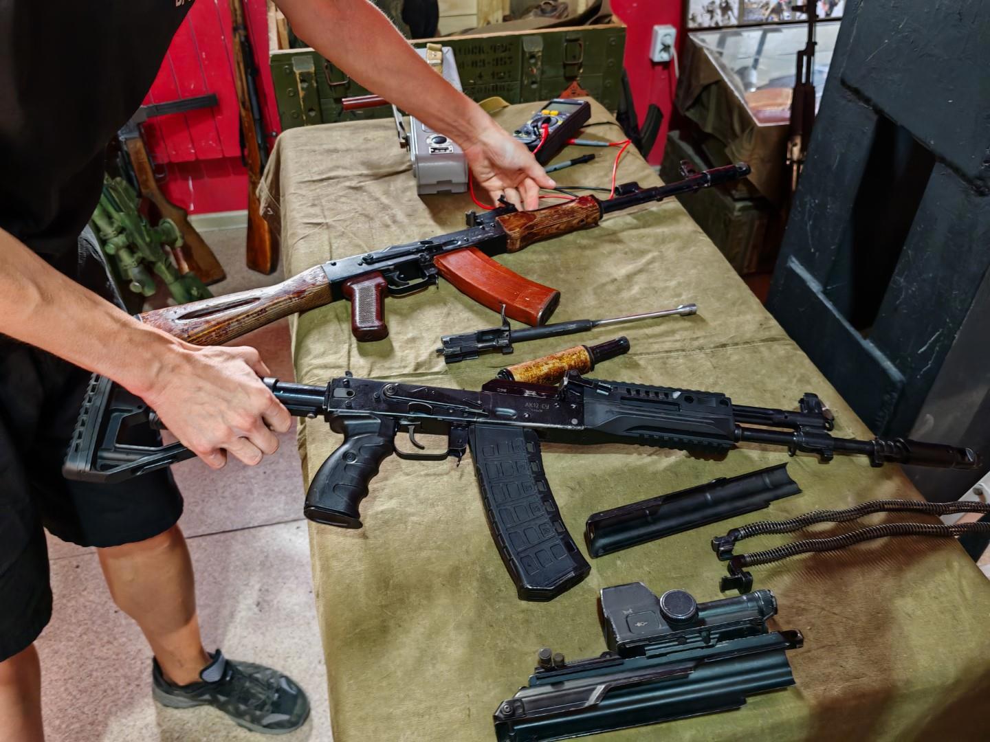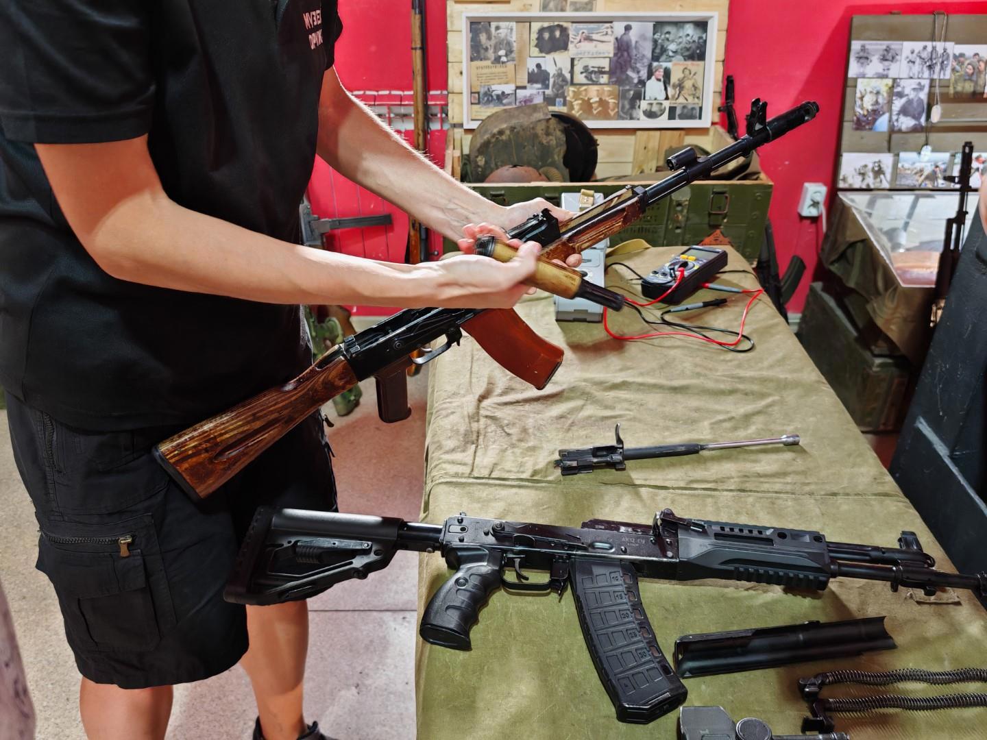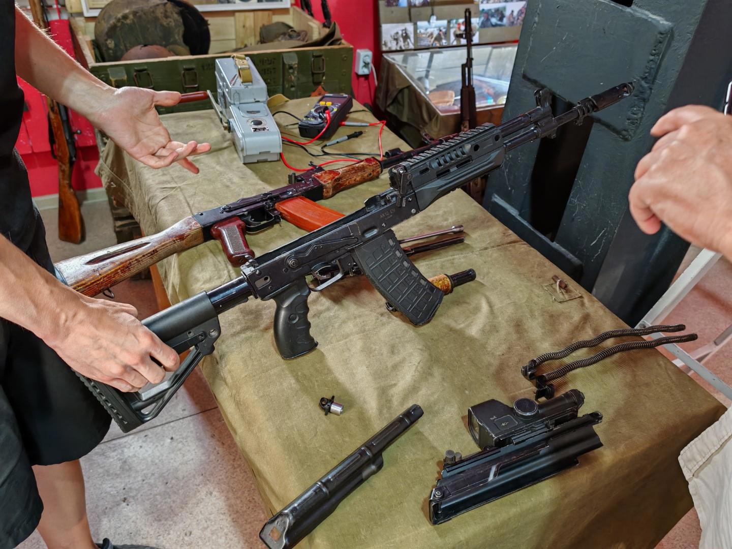 Сотрудник музея Владимир демонстрирует неполную разборку двух АК. Пока все без разницы. К слову видны на магазине АК-12 прозрачные участки.