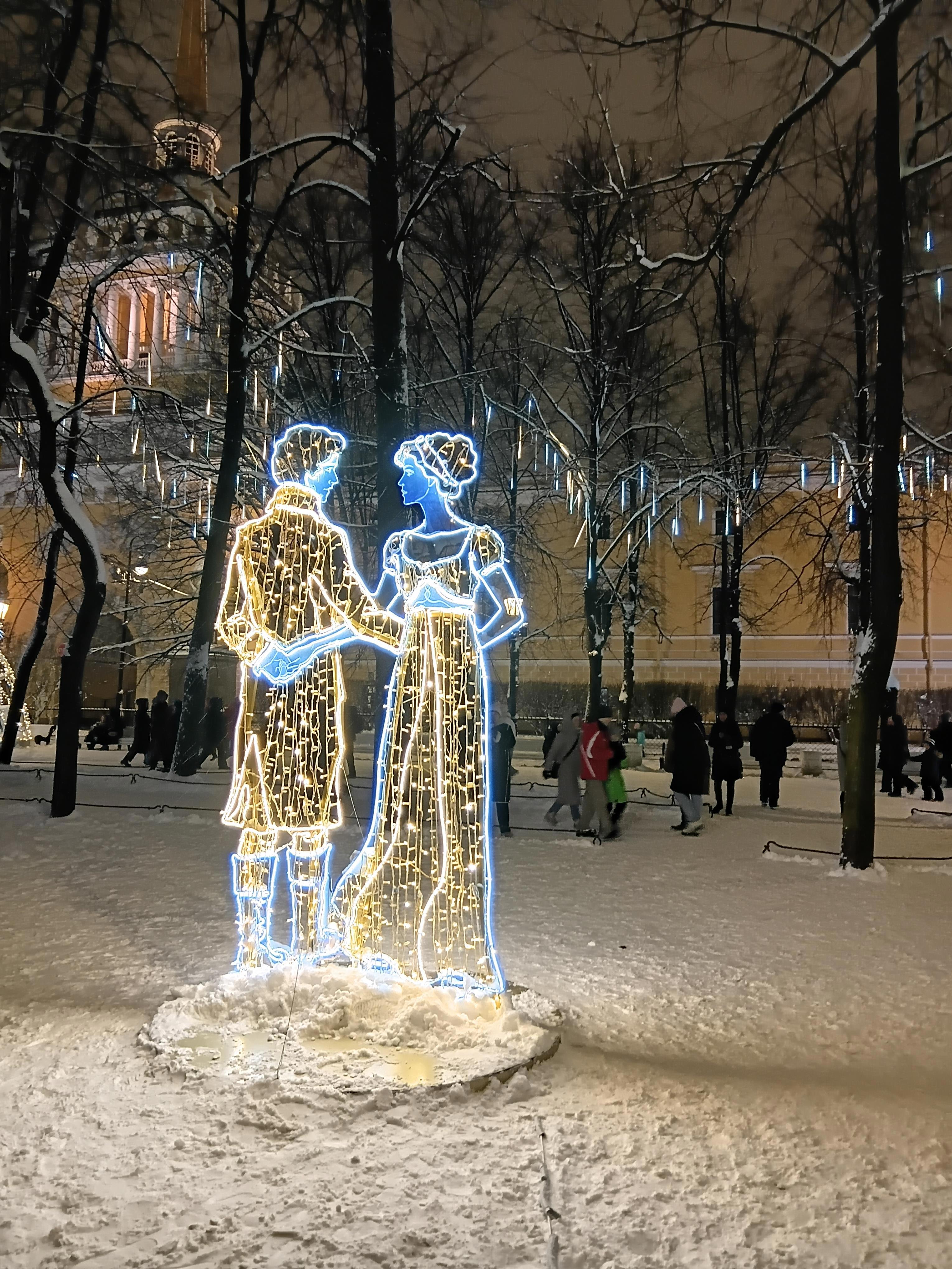 Струящиеся с деревьев световые капли - такой стала территория вокруг Адмиралтейства.