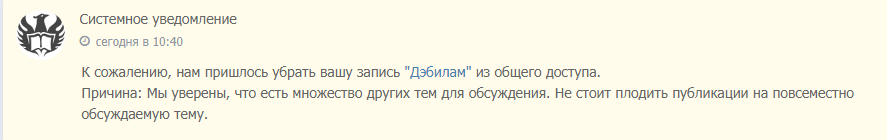 Захотел высказаться на "повсеместно обсуждаемую тему" - отдыхай. Интересно, а в правилах сайта есть запрет на посты про "повсеместно обсуждаемую тему"?))