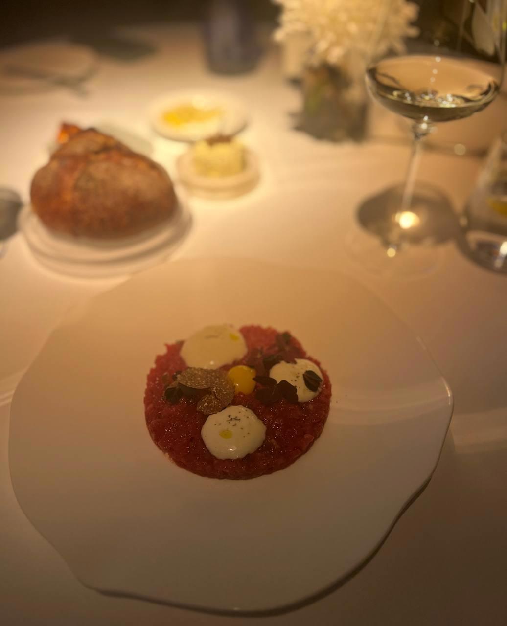Помимо масла с хлебом и тарталеток, которые они подают в качестве комплимента обычно всем, нам принесли дополнительную порцию тарталеток и невероятно вкусную закуску - трюфель на сладкой подушке.