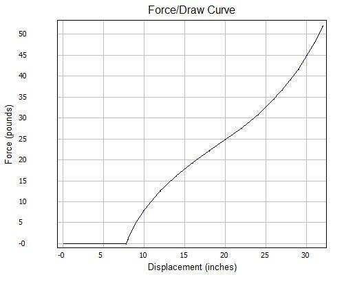 Вот один из многих графиков усилия натяжения для традиционного лука. Видим, что он неравномерный. И при растяжении на 28 и 30 дюймов у нас изменится не только длина прохождения тетивы, но и усилие на ней. Большинство традиционных луков на больших растяжениях начинают тянуться туже, "дубить".
