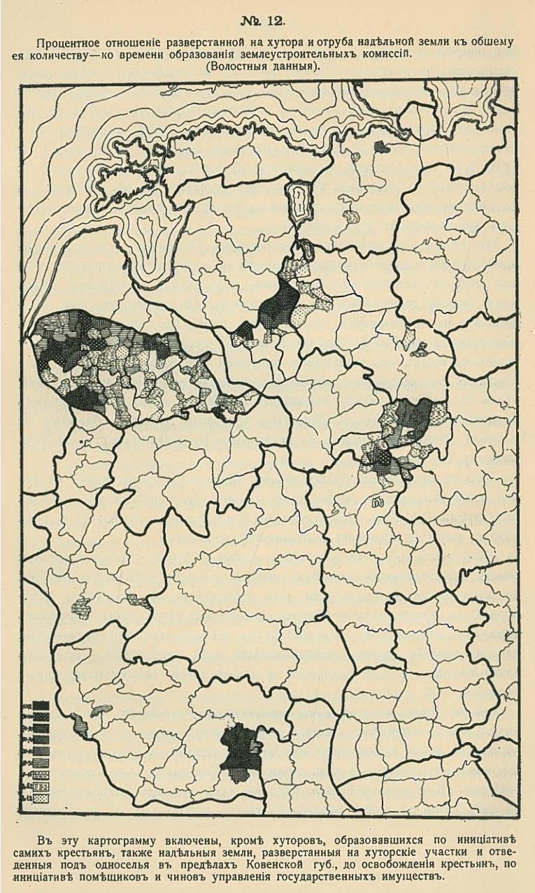 Из-за границъ хуторское расселение проникло въ Россію въ двадцатыхъ годахъ прошлого столѣтія, когда оно стало распространяться въ Царствѣ Польскомъ, по примѣру собственныхъ Пруссиевъ. Честное на хуторьяхъ, какъ тамъ говорятъ, — въ колонияхъ, главныхъ образцѣхъ, казенныхъ крестьянъ, которые въ то время перво-підѣлись съ большими на общей. Быстрое распространеніе расселенія началось, однако, только съ шестидесятыхъ годовъ, когда крестьяне Сувалкской губерніи взялись за него по собственному поучину. Оттуда движеніе уже въ семидесятыхъ годахъ перешло въ Ковенскую губернію, гдѣ оно до сихъ поръ распространяется въ нѣсколькихъ уѣздахъ.