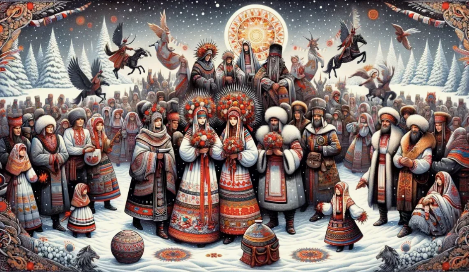 Шли колядники гуртом: парни и девки, ребятишки и взрослые. Вывернутые мехом наружу тулупы, шапки с лентами, маски - медведь, журавль, старик с длинным носом. Кто-то с бубном, кто-то с трещотками, кто-то нёс ту самую звезду со свечой, что плясала желтой точкой в морозном воздухе над головами. Смеялись громко, показывали, что зиму не боятся. Говорили нарочно весело, чтобы морозы быстрее отступили.