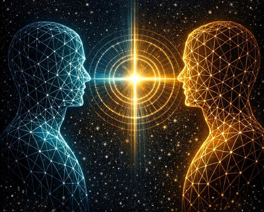 Один символ сам по себе не несёт смысла. Смысл появляется только там, где есть отношение: отправитель и получатель, вопрос и ответ, модель и проверка. Даже в физике “координата” - не свойство частицы, а способ описания относительно выбранной рамки. Без внешнего эталона и канала сверки любое «я вижу» быстро превращается в замкнутую галлюцинацию. «Где двое…» - это минимальная схема реальности. Минимум две точки, между которыми возможна разность, а значит - связь. Один задаёт вопрос (направление воли), другой даёт сопротивление/структуру (проверку). Они не должны быть одинаковыми (тогда нечего различать), но и не должны быть уничтожающими друг друга. Они должны быть сопряжёнными: разными, но связанными общей логикой.