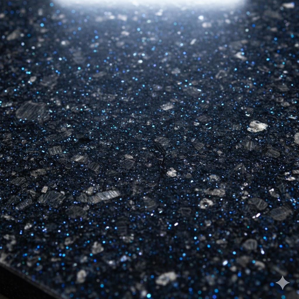 - Цвет: Темно-синий, часто с «искорками» или переливами (иризацией).
