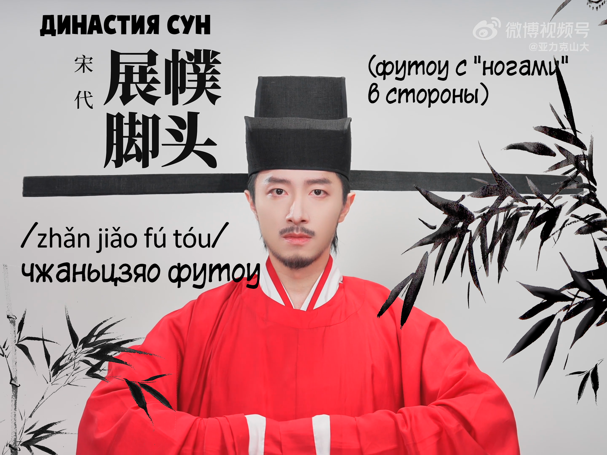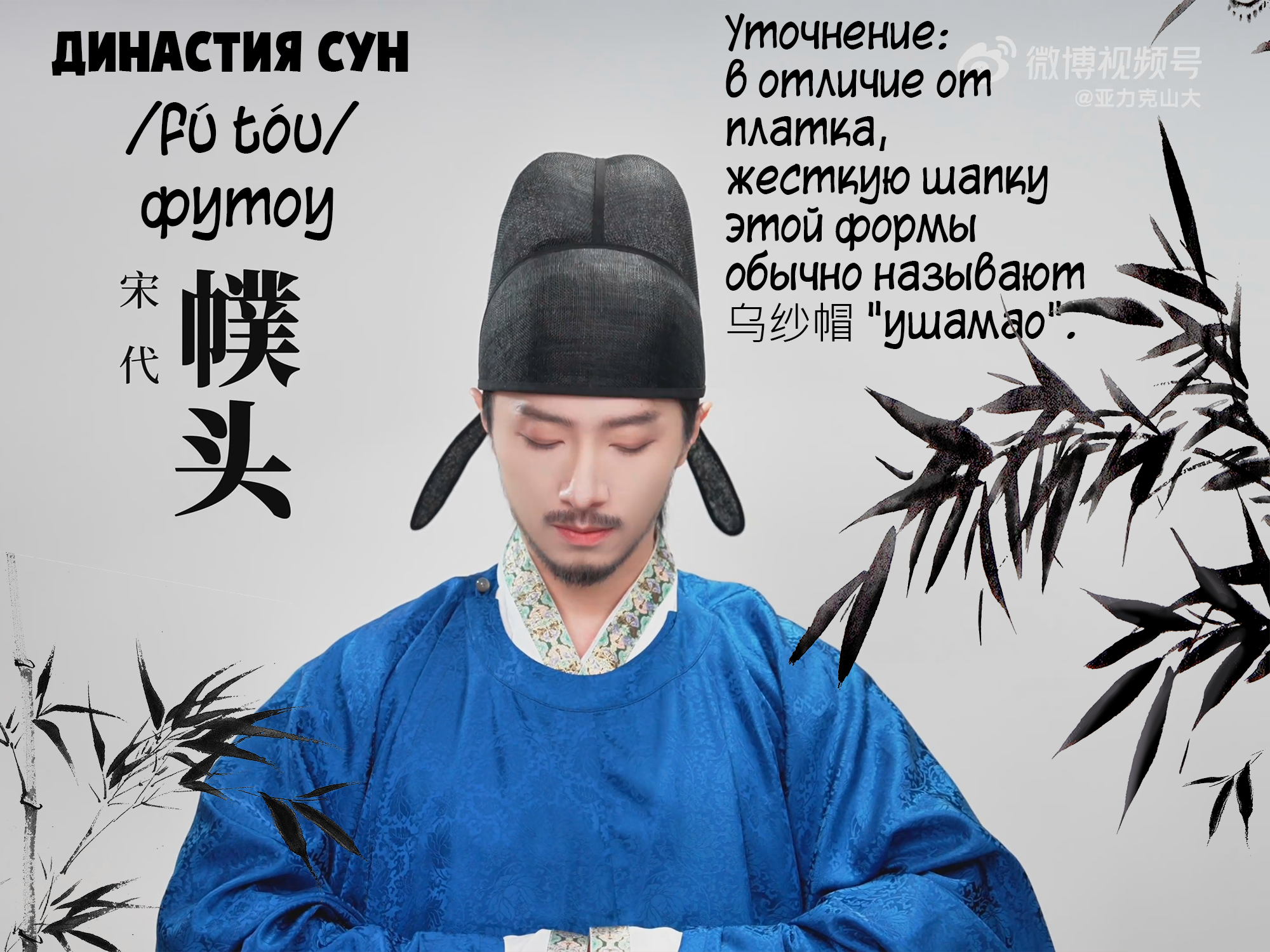 宋代 династия Сун - 展脚幞头 /zhǎn jiǎo fú tóu/ чжаньцзяо футоу (футоу с "ногами" в стороны) (уточнение: футоу здесь уже не является платком, но сохраняет форму, свойственную повязке футоу)