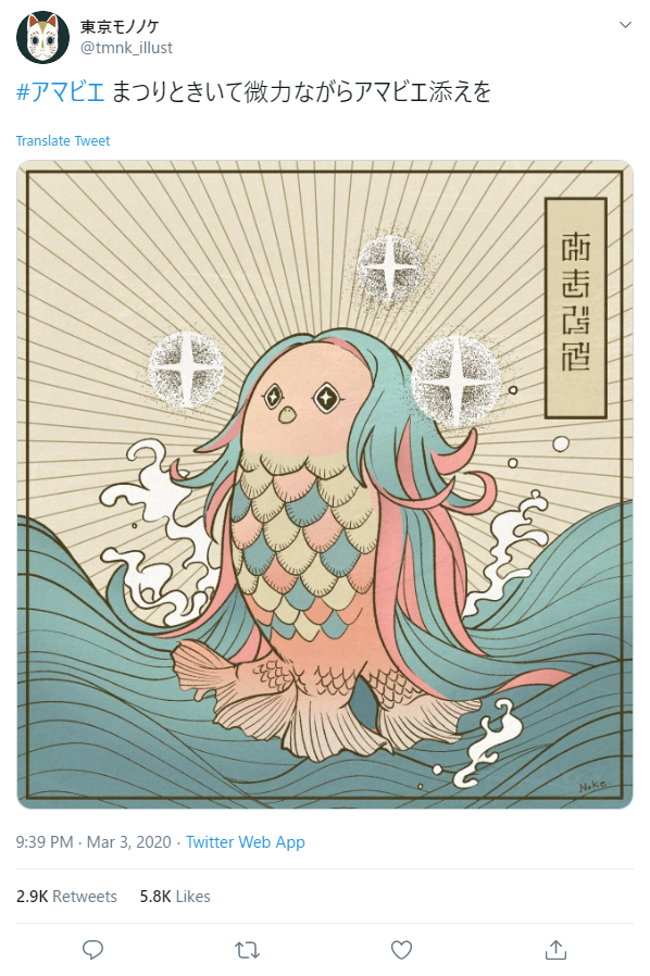 Есть версия, что «Амабиэ» — это оговорка или неправильное написание «Амабико» (ёкай, предсказывающий будущее). Но я считаю, что это не оговорка, а всего лишь его разновидность, водящаяся возле побережья Кюсю, ну и в Кумамото точно врать не будут. И именно этот ёкай нам сейчас и нужен.