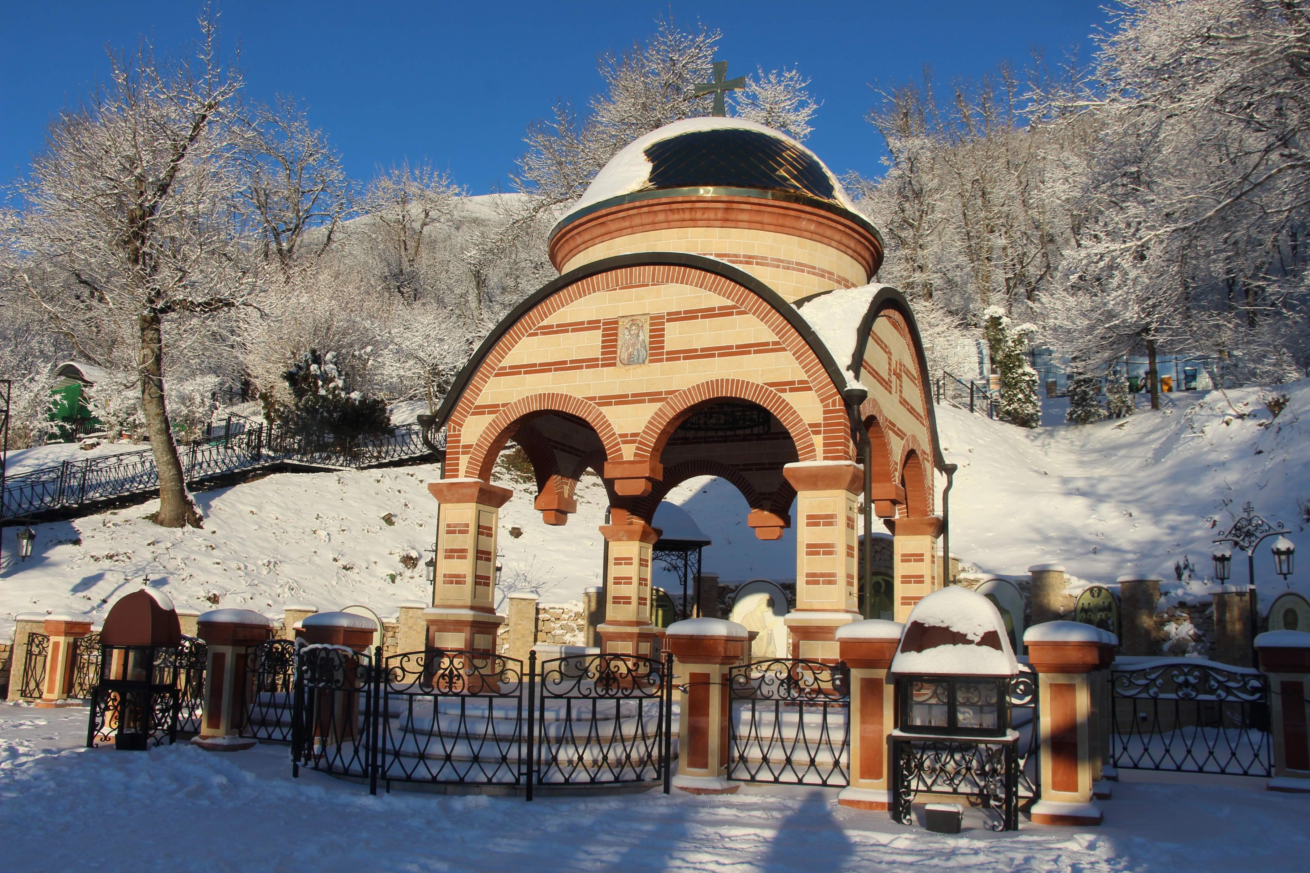 Приехали они в монастырь около четырех часов дня. Еще было голубое небо и снег блестел на солнце. Но к пяти часам солнышко засобиралось на покой и удалось снять вот такие красивые кадры.