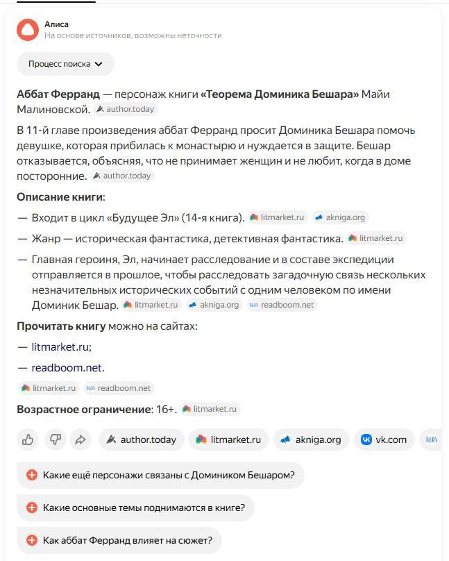 А порой я забываю, как пишется имя того или иного персонажа. Например Аббат Ферранд из "Теоремы Доминика Бешара". В данном случае я забыла количество "р". Нет, чтобы влезть в собственный текст или подумать, откуда имя взялось, я пошла в поисковик. Вообще Яндекс с Алисой я терпеть не могу, как бы эту хрень там вырубить.