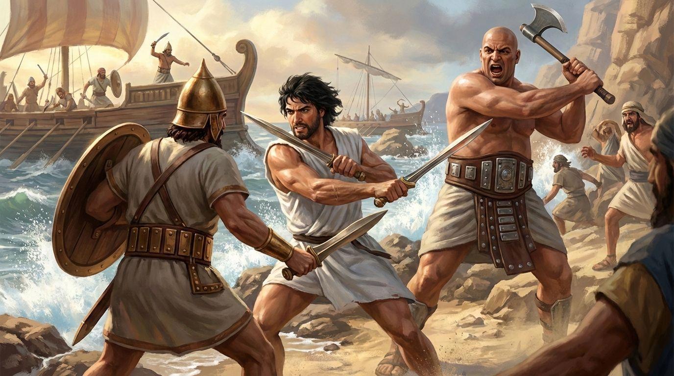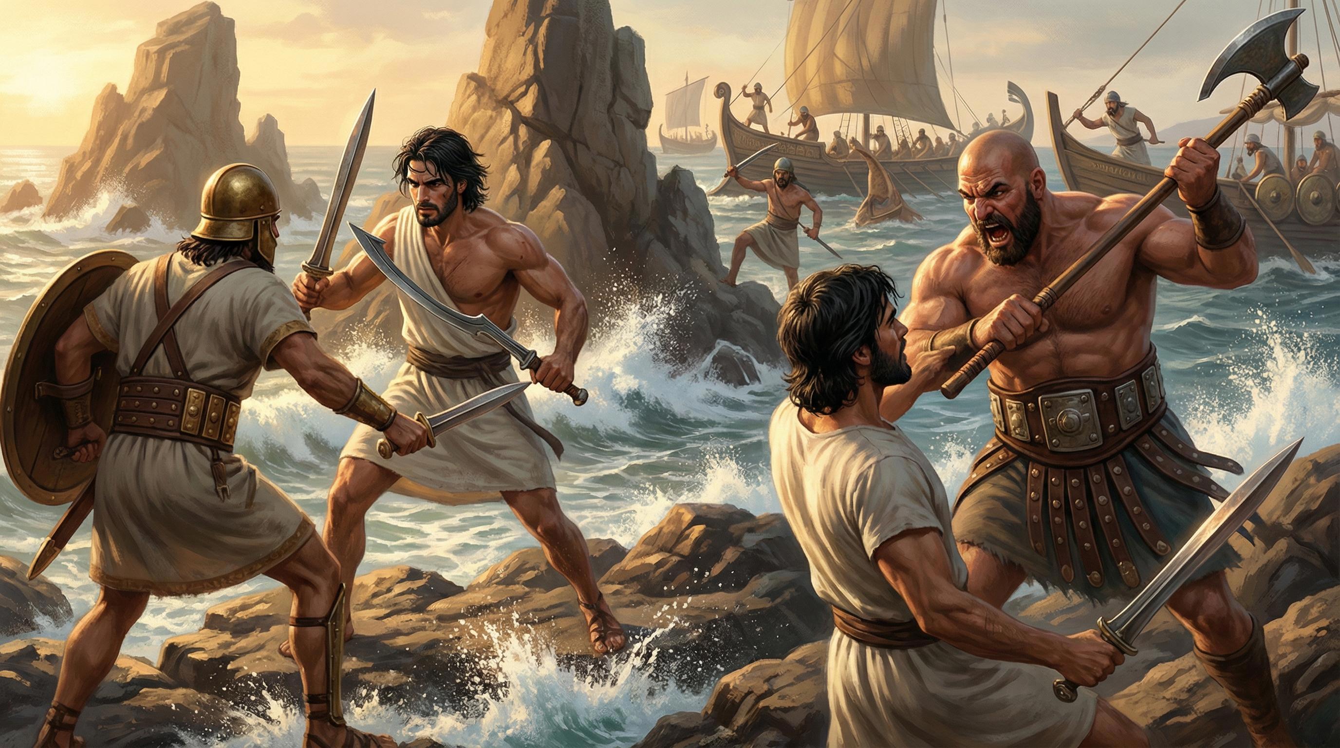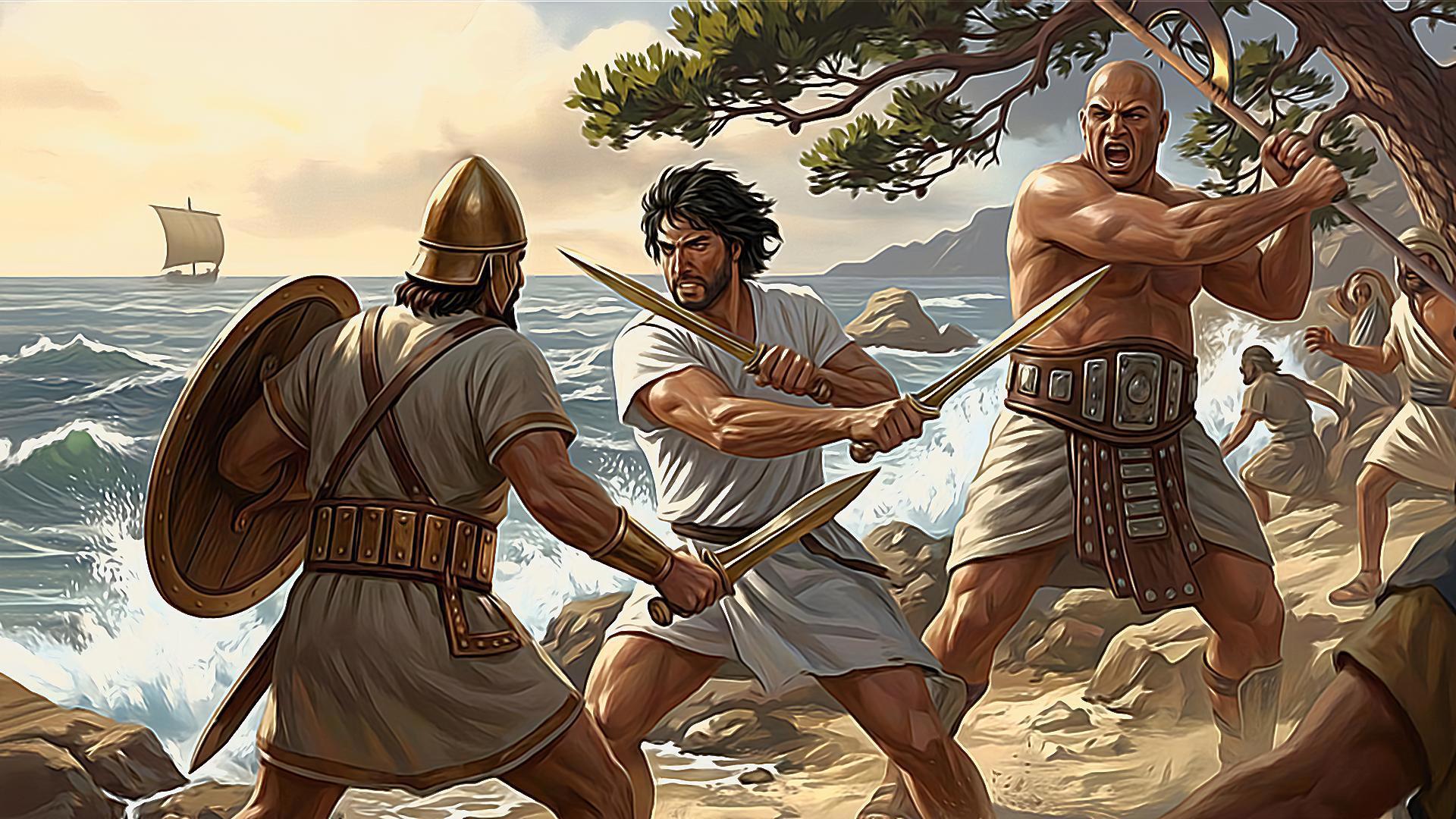 Бронзовый век. Каменистый берег моря на ближнем востоке. На переднем плане мускулистый мужчина в белой тунике до колен, черные растрепанные волосы, короткая борода, двумя короткими бронзовыми мечами отбивается от противника, финикийского пирата. На пирате туника, очень широкий кожаный пояс с бронзовыми пластинками, круглый бронзовый шлем, в руках круглый щит и короткий бронзовый меч. С другой стороны, сбоку, на мужчину с двумя мечами напал лысый здоровяк в юбке и очень широком кожаном поясе с металлическими пластинами. Здоровяк выше ростом, размахивается большой египетской однолезвийной секирой на длинной рукояти, которую он держит двумя руками, кричит. На заднем плане бьются еще несколько человек в похожей одежде и с похожим вооружением. Драматичная динамичная и кинематографичная сцена боя. Цифровой арт