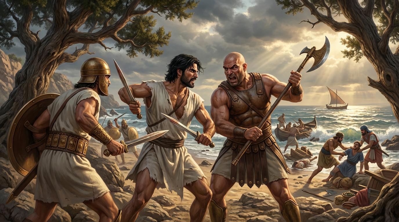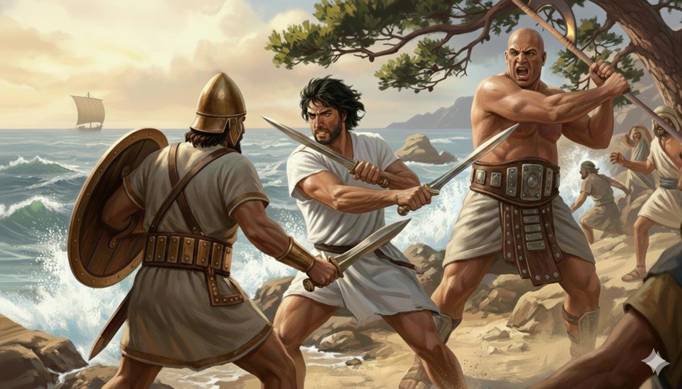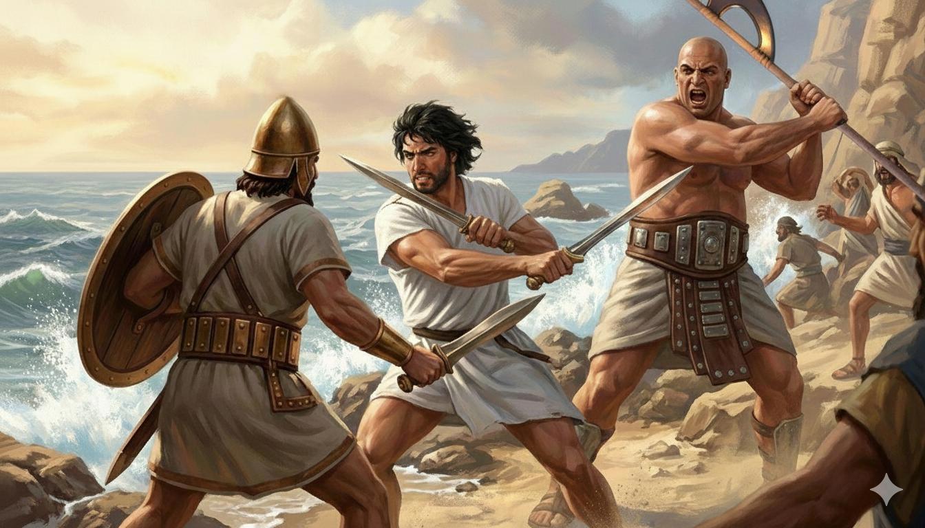 Бронзовый век. Каменистый берег моря на ближнем востоке. На переднем плане мускулистый мужчина в белой тунике до колен, черные растрепанные волосы, короткая борода, двумя короткими бронзовыми мечами отбивается от противника, финикийского пирата. На пирате туника, очень широкий кожаный пояс с бронзовыми пластинками, круглый бронзовый шлем, в руках круглый щит и короткий бронзовый меч. С другой стороны, сбоку, на мужчину с двумя мечами напал лысый здоровяк в юбке и очень широком кожаном поясе с металлическими пластинами. Здоровяк выше ростом, размахивается большой египетской однолезвийной секирой на длинной рукояти, которую он держит двумя руками, кричит. На заднем плане бьются еще несколько человек в похожей одежде и с похожим вооружением. Драматичная динамичная и кинематографичная сцена боя. Цифровой арт