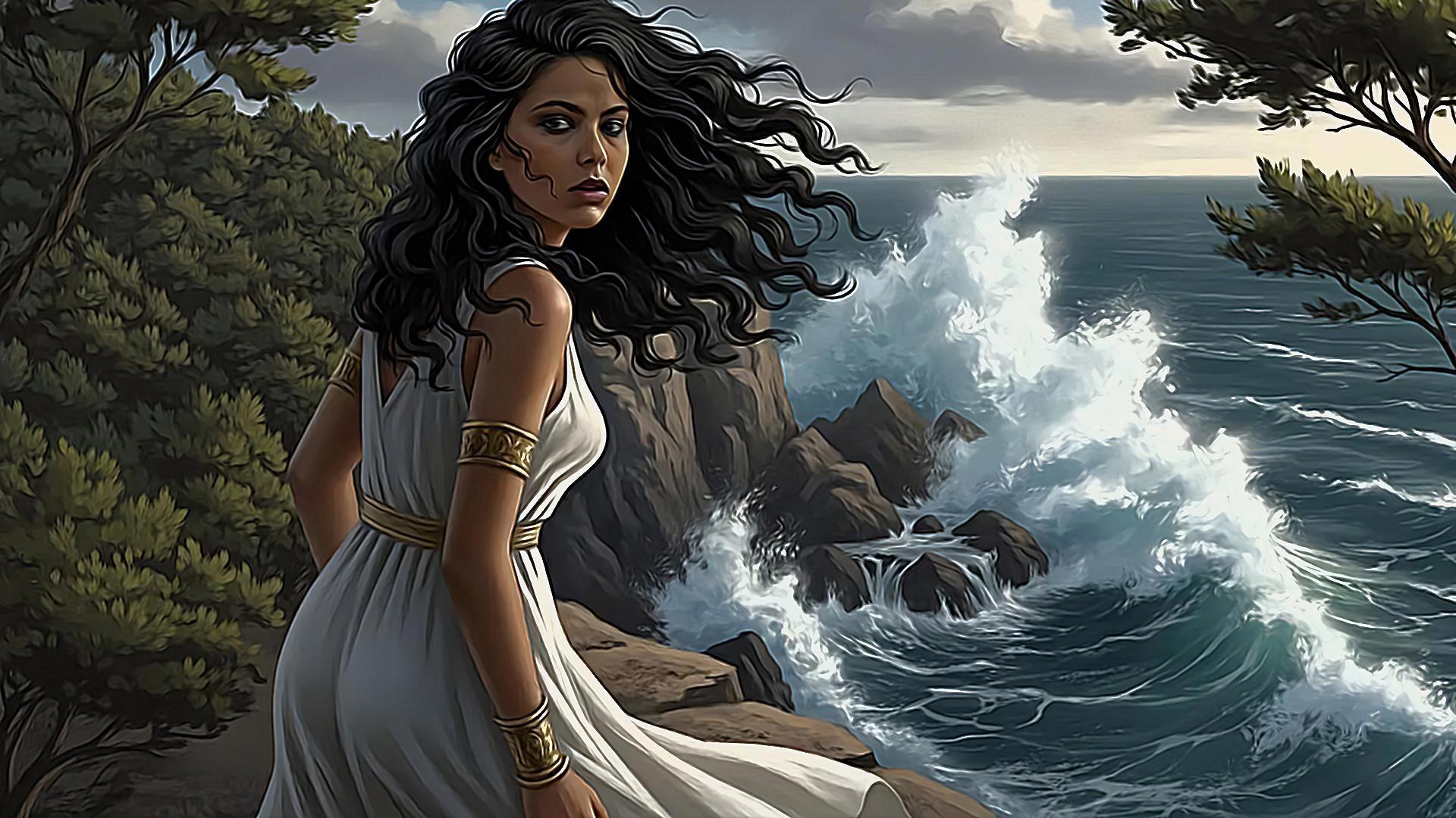 А дальше там по сюжету Амфитея, думая, что её муж погиб, бежит от пиратов и прыгает в море со скалы.