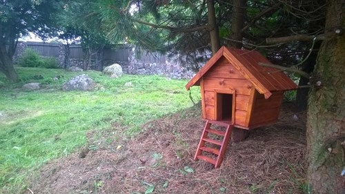 Этот домик я сделал для всех желающих. Ему уже год. Заглядывали птицы, белка, ласка, но приспосабливать помещение под жильё никто не захотел - пугают собаки и люди. Жена высказала мнение, что туда иногда забирается шишок. Делает это, когда сильно набезобразничает в доме, где живут люди, собаки и кошки. Там шалить одно удовольствие, но тамошние жители почему-то шибко недовольны. Вот и прячется озорник от возмущённых обитателей, но ненадолго.