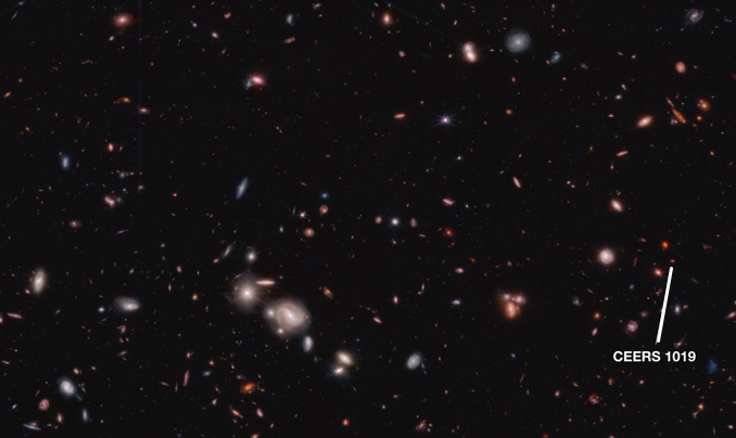 CEERS 1019 - древнейшая из наблюдаемых учеными черных дыр на сегодня. Ее открыли с помощью космического телескопа Джеймс Уэбб в центре очень далёкой галактики.