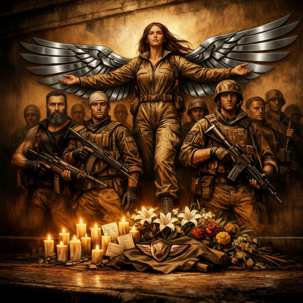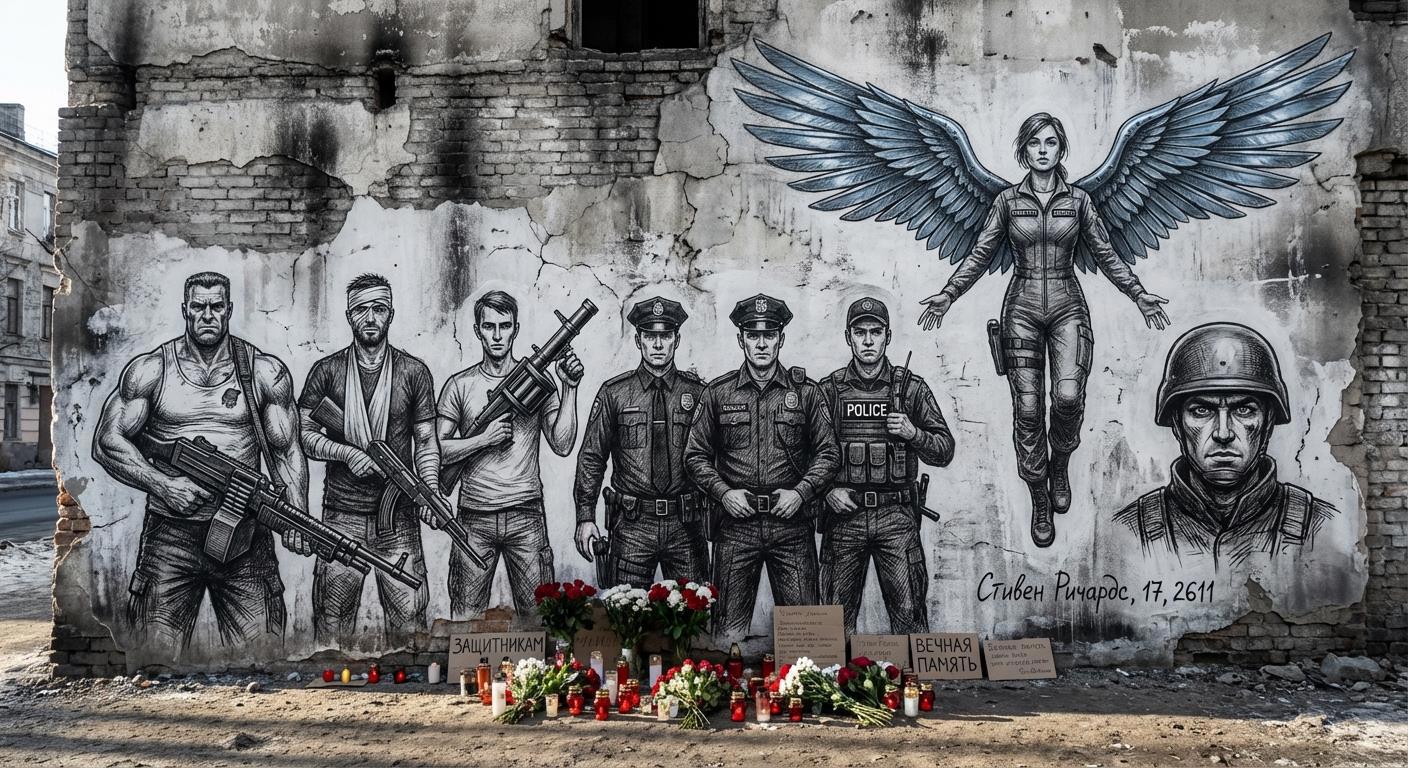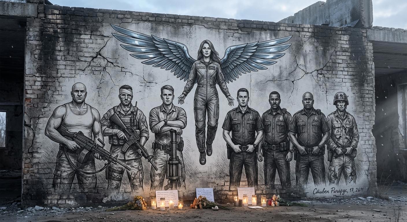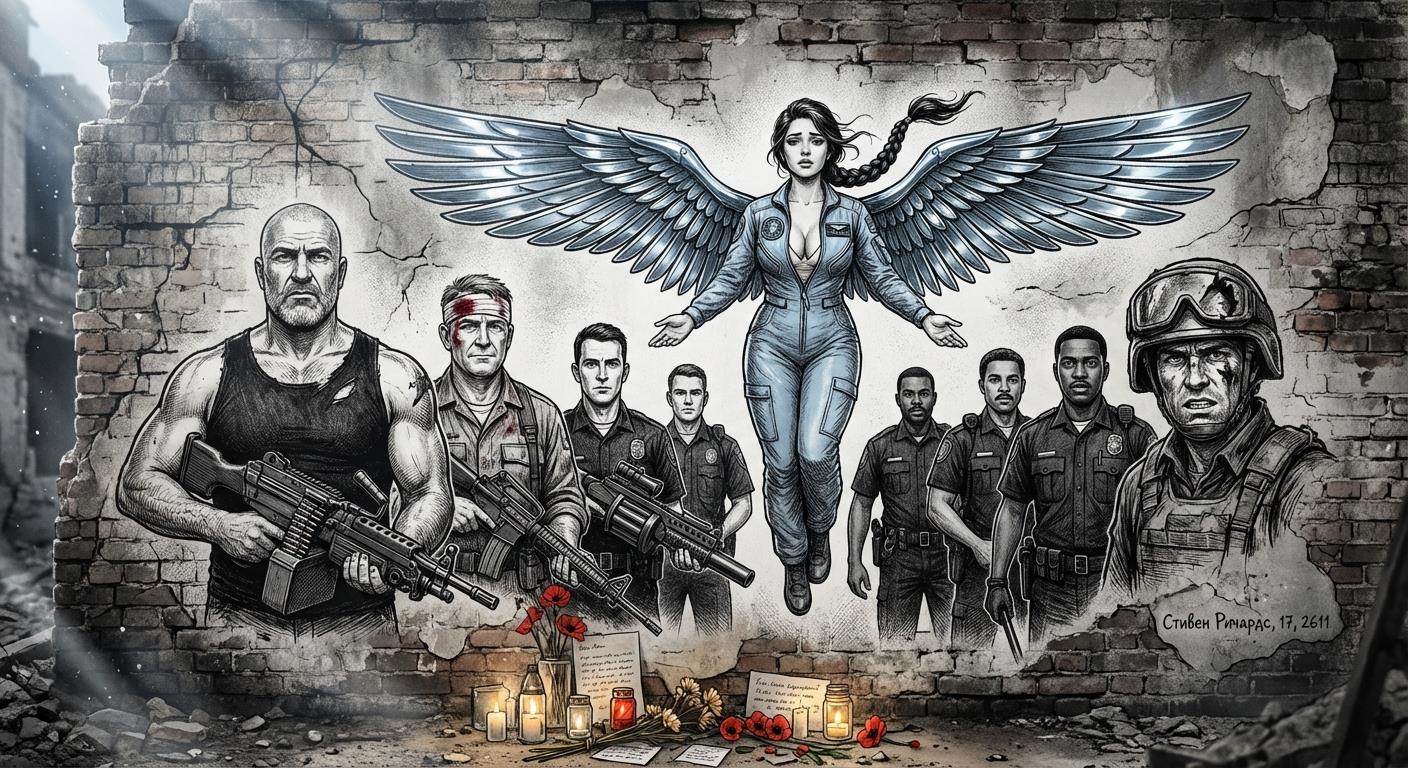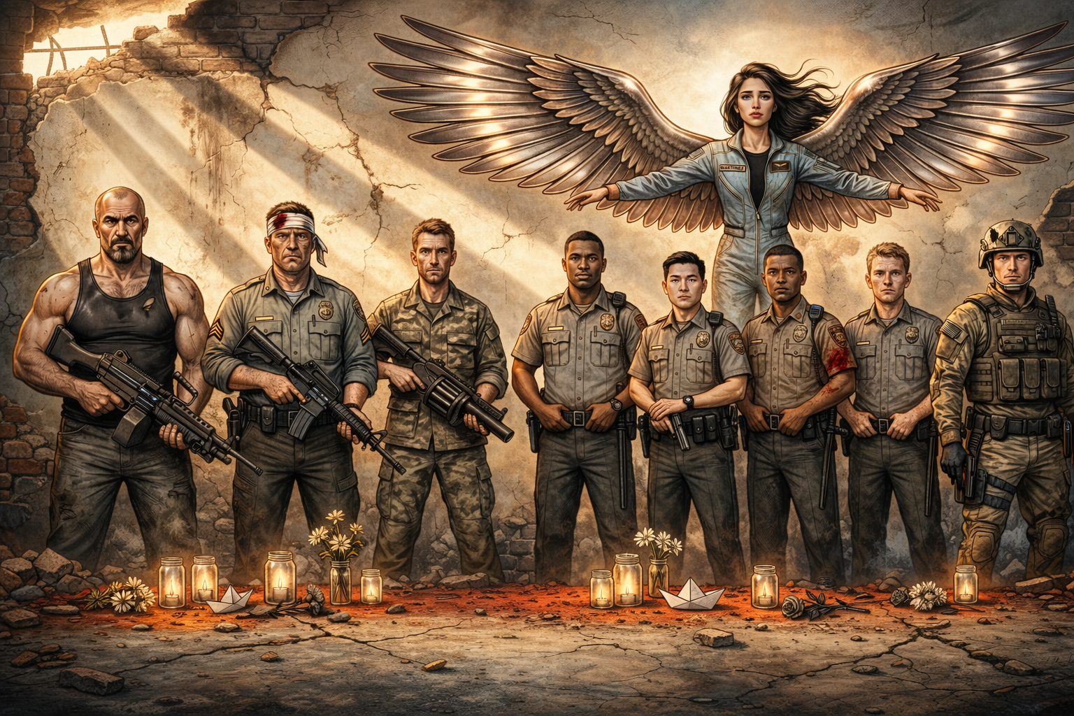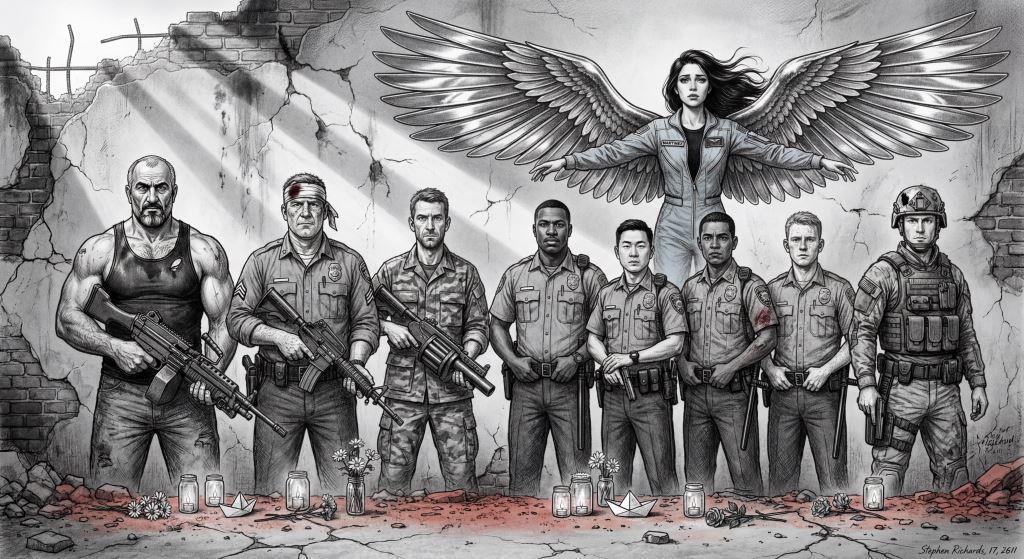Для тех, кто "Копа" не читал: на этой картине малолетний шалопай и хулиган нарисовал полицейских, погибших у него на глазах, спасая родной Булыжник, живущих там людей и его лично от вторжения многократно превосходящих сил врага. Погибшие, но не сдавшиеся.