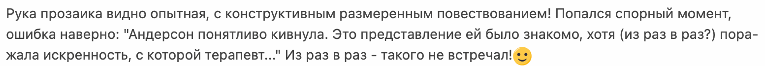 И похвалил, и на недочёт спокойно указал. Не в первый раз, к слову. Кстати, Александр у меня теперь за корректора (шутка). Я безмерно благодарна ему за то, что он так цепко вылавливает ошибки и опечатки в моих текстах.