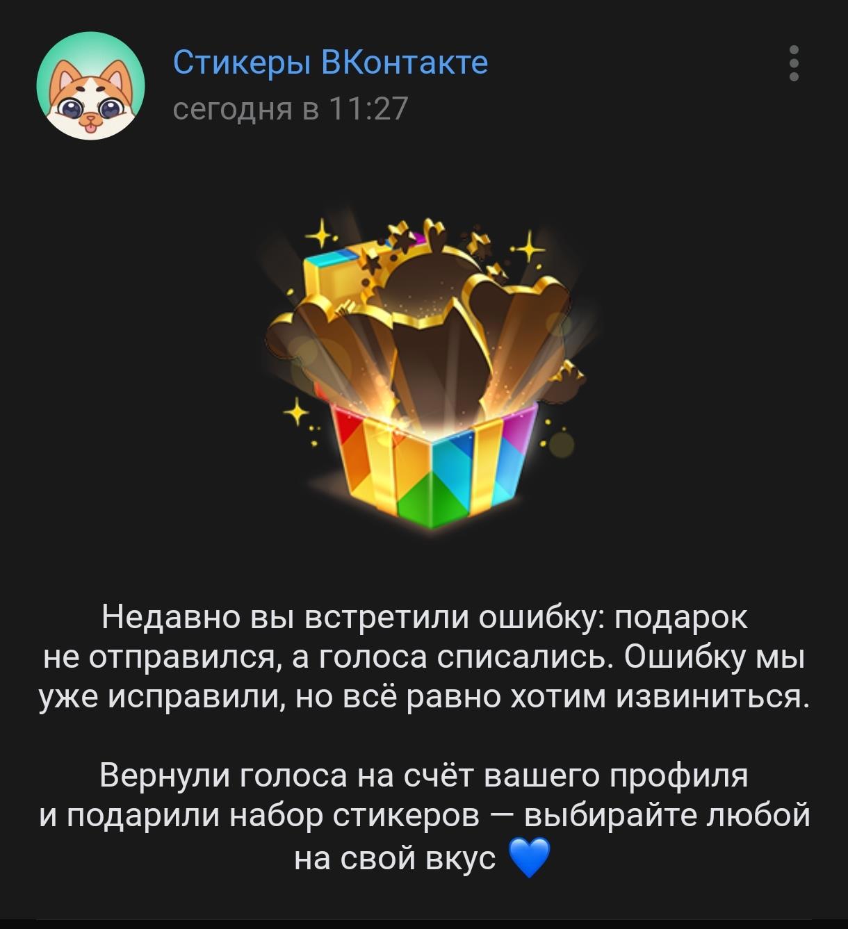 Во-первых, сюрприз от ВК! Прислали подарочный пак стикеров за найденную ошибку. Теперь у меня есть та самая крутая классная девочка, которую можно слать друзьям. Мелочь, а приятно!