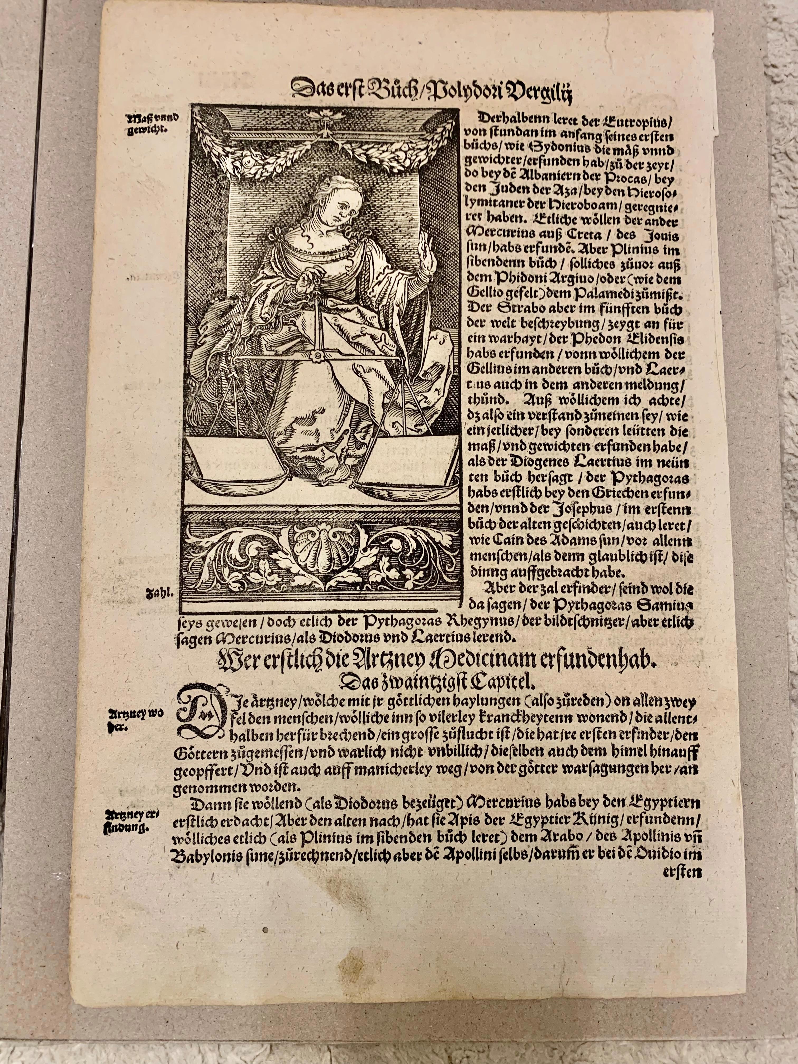 На изображении представлена страница из немецкого перевода энциклопедического труда «De inventoribus rerum» («О первооткрывателях вещей») итальянского ученого и дипломата Полидора Вергилия. Книга содержит гравюру с изображением женской фигуры с весами, и здесь это не то, чтобы прямо аллегория, она просто символизирует открытие мер и весов, о чем говорится в сопровождающем тексте.