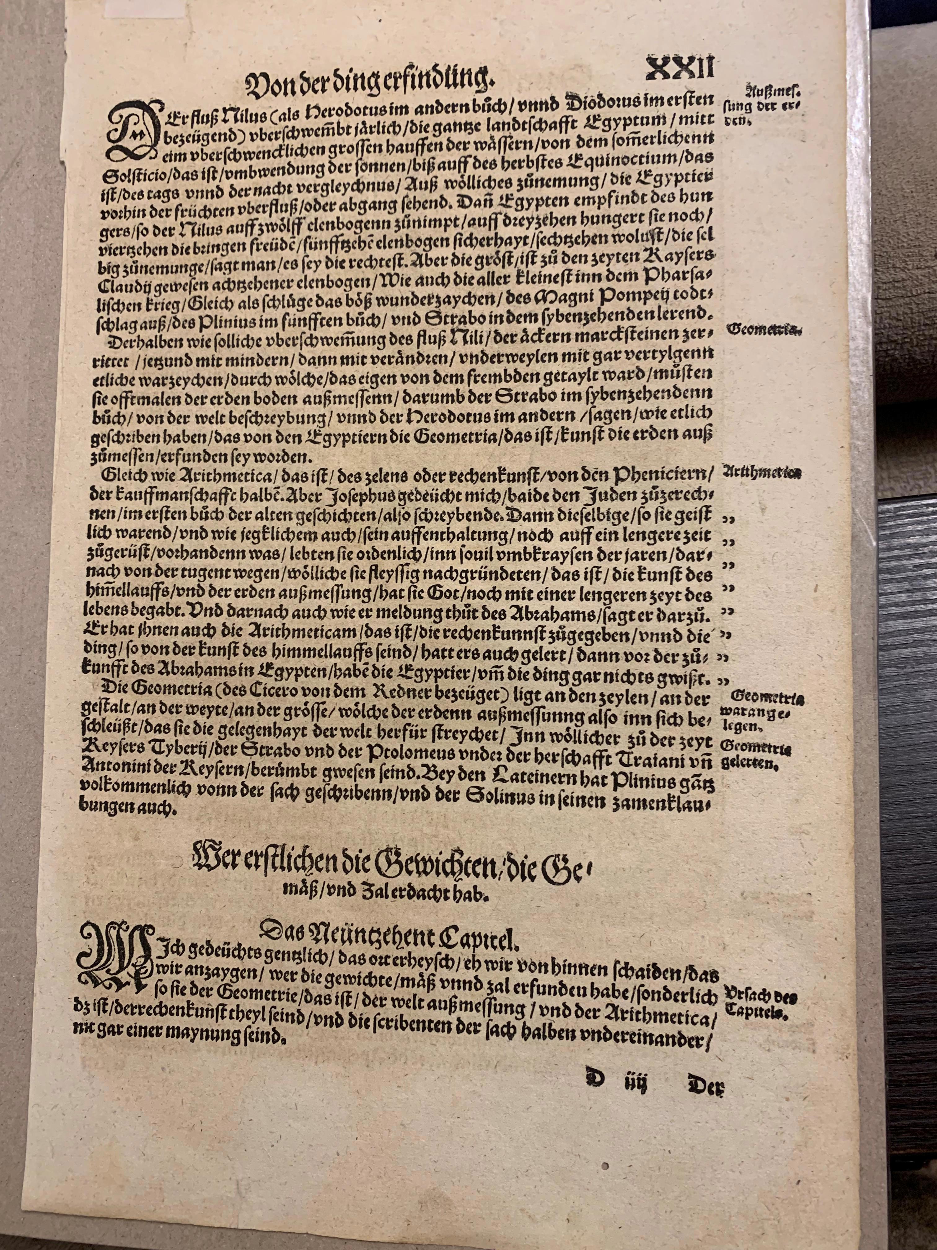 - Содержание страницы: Текст на странице посвящен истории изобретений, в частности, кто первым изобрел меры и веса, а также медицину (глава «Das zwayntzigst Capitel» — Глава двадцать вторая).