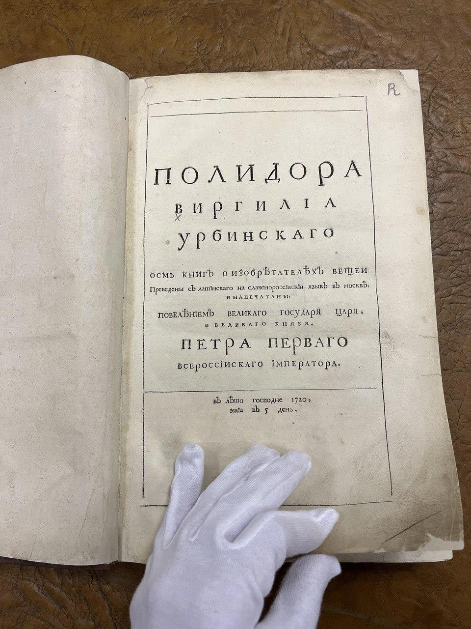 А сам книжный памятник книга «Полидора Виргилия Урбинскаго осмь книг о изобретателех вещей» хранится в редком фонде Политехнической библиотеки.
