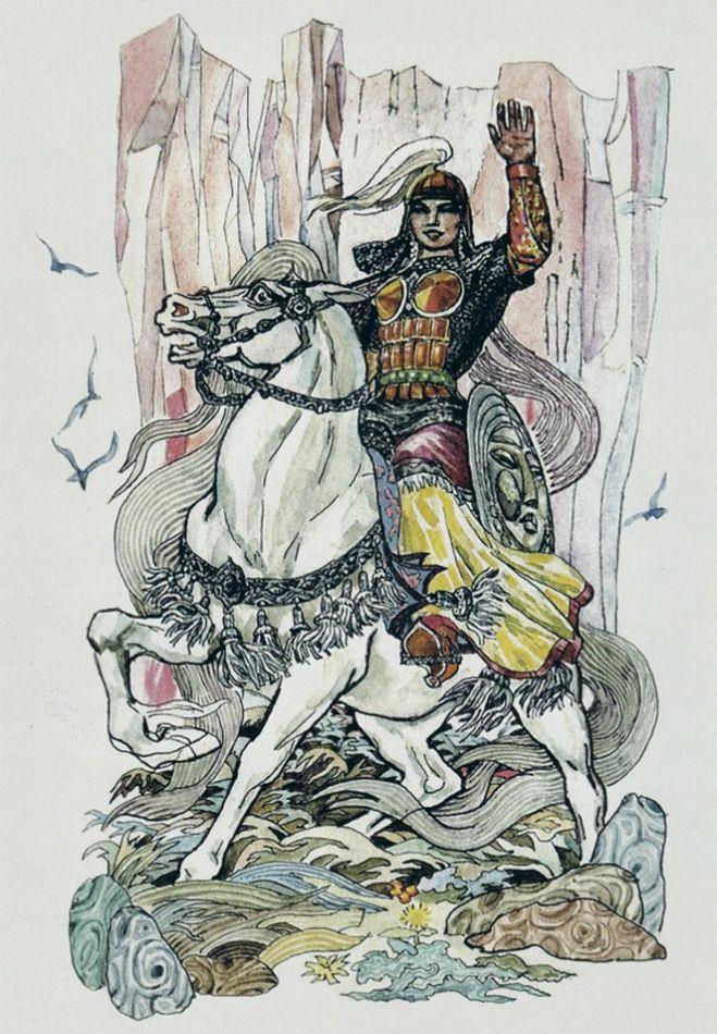 Посмотрите, как хороша дева богатырша Алтын Арыг на бело-игреневом коне. За спиной девушки горы, в которых она родилась, впереди простор степей и приключения.