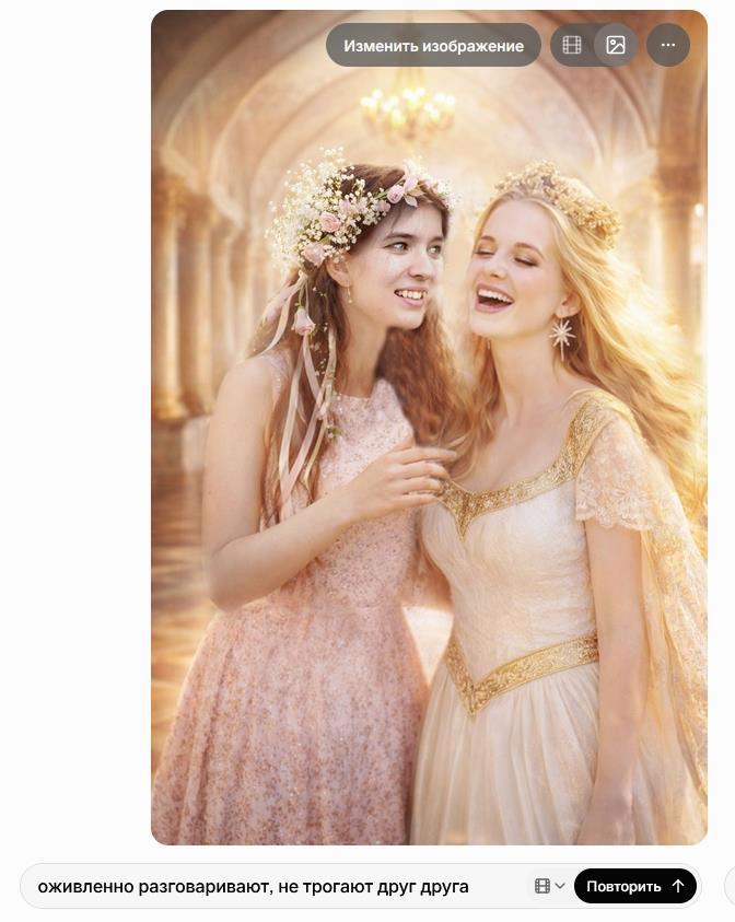 Получив удачный первый кадр, вы идете в Грок (требуется сервис из трех букв). Видео, которое я приложила в начале, получилось вообще без промтов, это просто то, что придумала сама нейросеть. Но, если вам требуется что-то иное, вы можете при генерации видео задать промт и описать в нем, что должно происходить. Например, для генерации общего видео с моей героиней мне пришлось задать в промте, чтобы мы не трогали друг друга, иначе получалось нечто, что Роскомнадзор мог бы и не одобрить: