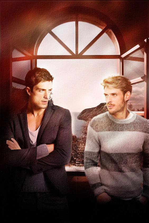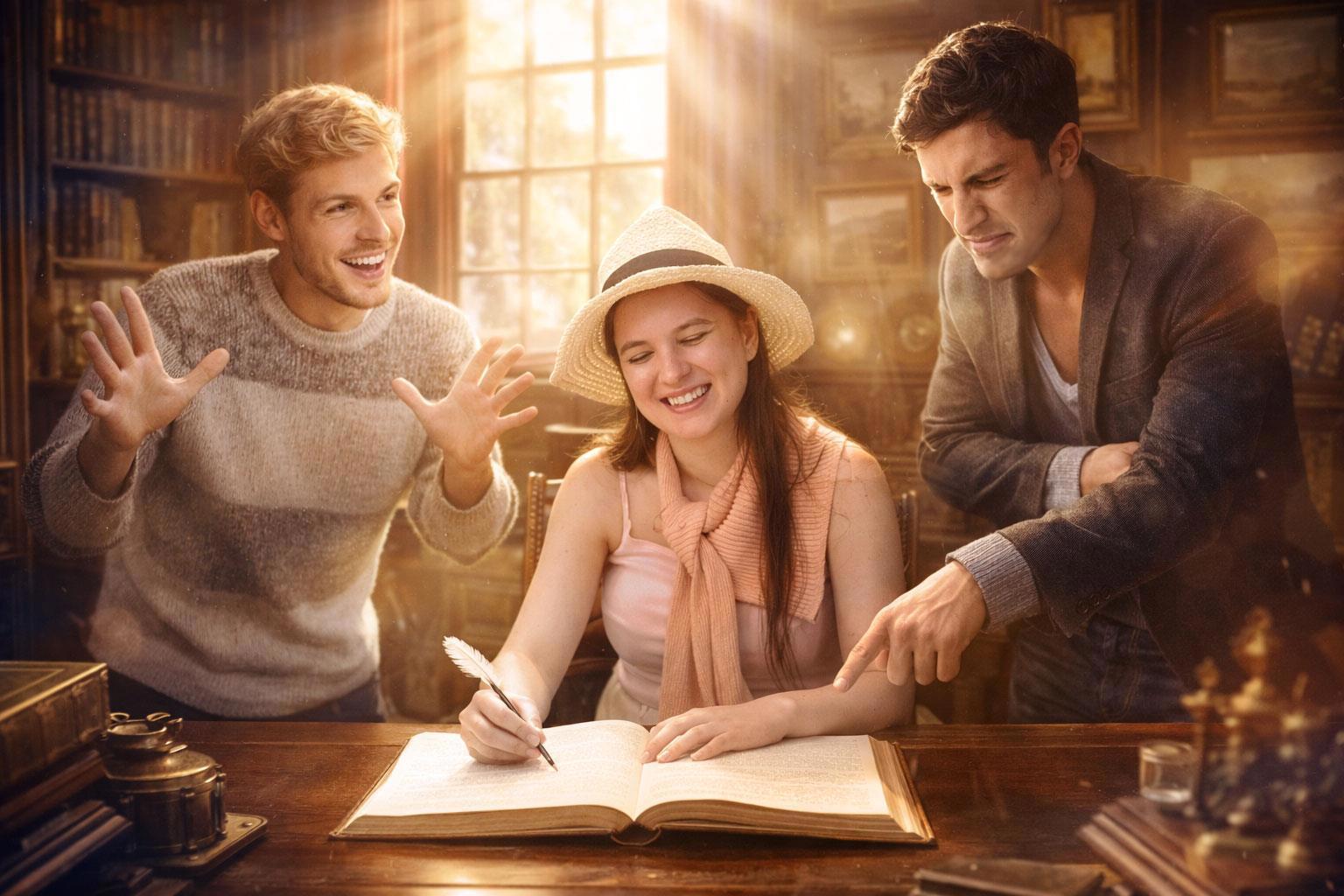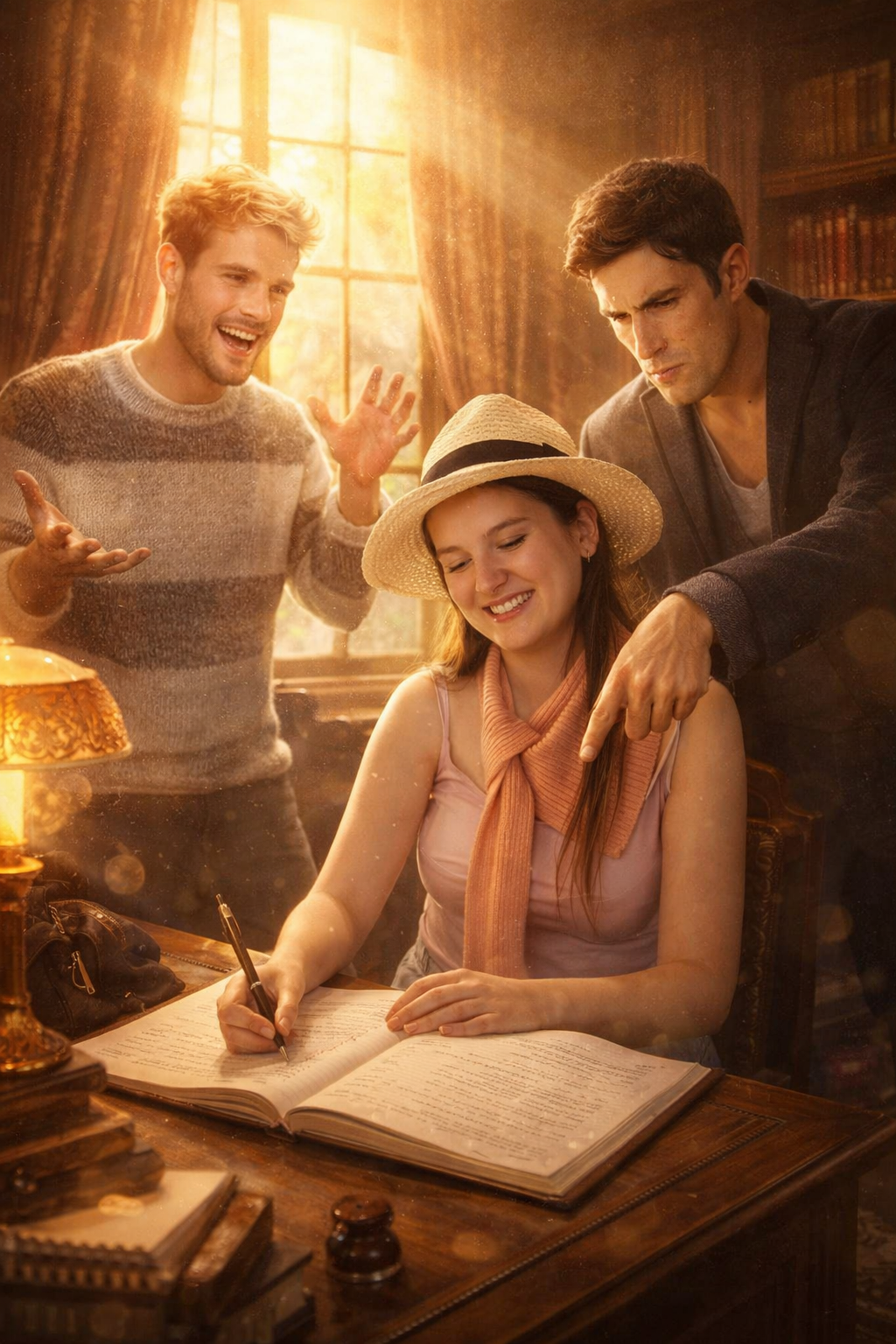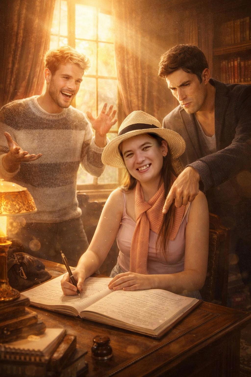 На первом фото - я, на втором - два персонажа моей книги. Сгенерируй новое совместное фото с нами. Интерьер 19-го века, кабинет, я сижу за столом и пишу в большой тетради. Двое персонажей стоят за мной. Блондин - слева от меня, он улыбается, взмахивает руками, что-то рассказывает, он очень радостный. Брюнет - справа от меня, он недоволен, хмурится и кривит губы, указывает в мою тетрадь, мол, исправь вон там. Выравняй экспозицию, цветовой баланс, свет и тень, чтобы все это смотрелось как цельное профессиональное фото. Добавь много солнца, блики