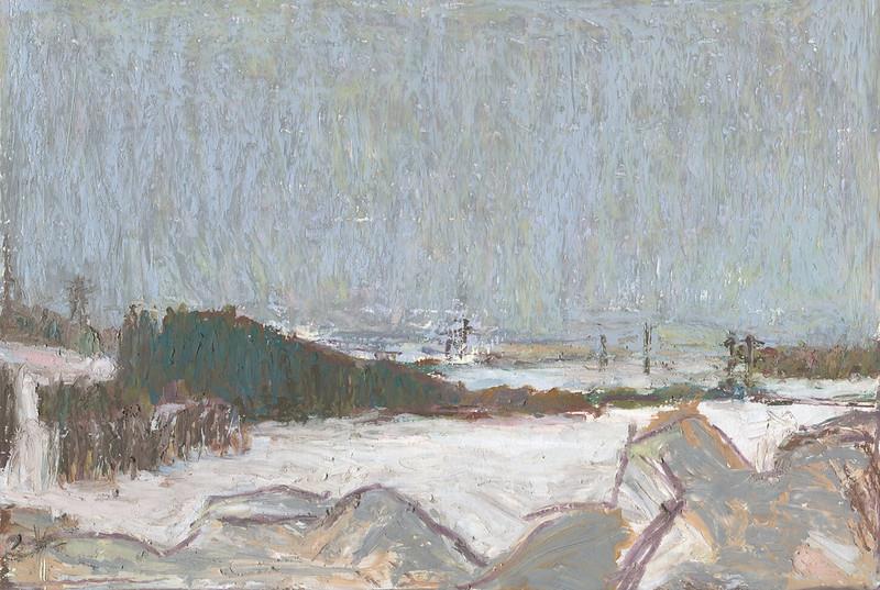 Второй вариант, вид с дороги на поле. Снова всё белое, небо чуть темнее. Редкие столбы чёрточками и столбы ЛЭП. Редкие бледные полосы перепадов высот в снегу.