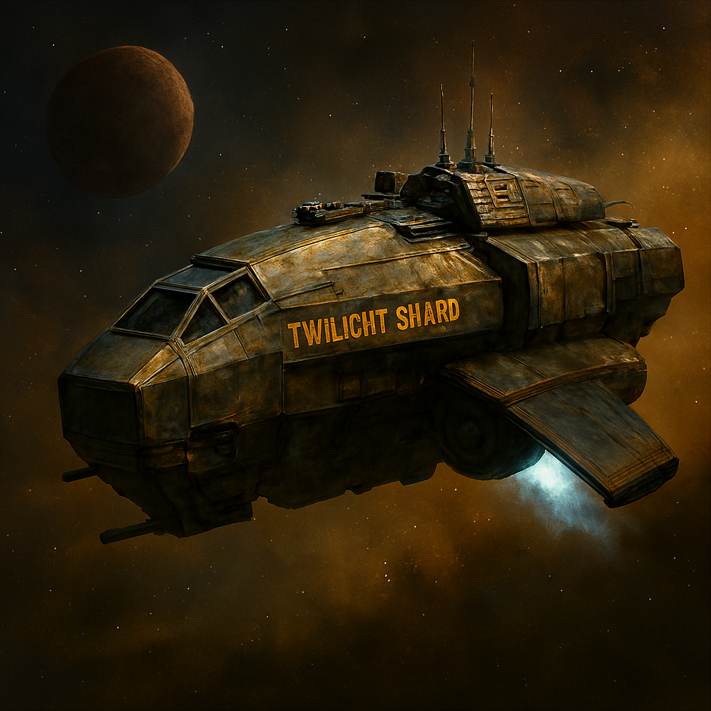 Она назвал Корабль «Сумеречный Осколок», намекая на своё прошлое и найденный кусок чёрного железа. Это был старый транспортник с обшивкой, покрытой следами ремонта и чужих боёв. Металл корпуса местами потемнел, словно обгорел, а некоторые панели явно заменены деталями от других судов. Продавец уверял, что корабль «надёжный», но его история скрыта. По слухам, он принадлежал то ли исследователям, которые исчезли в руинах, то ли контрабандистам, бросившим его после неудачного рейда.