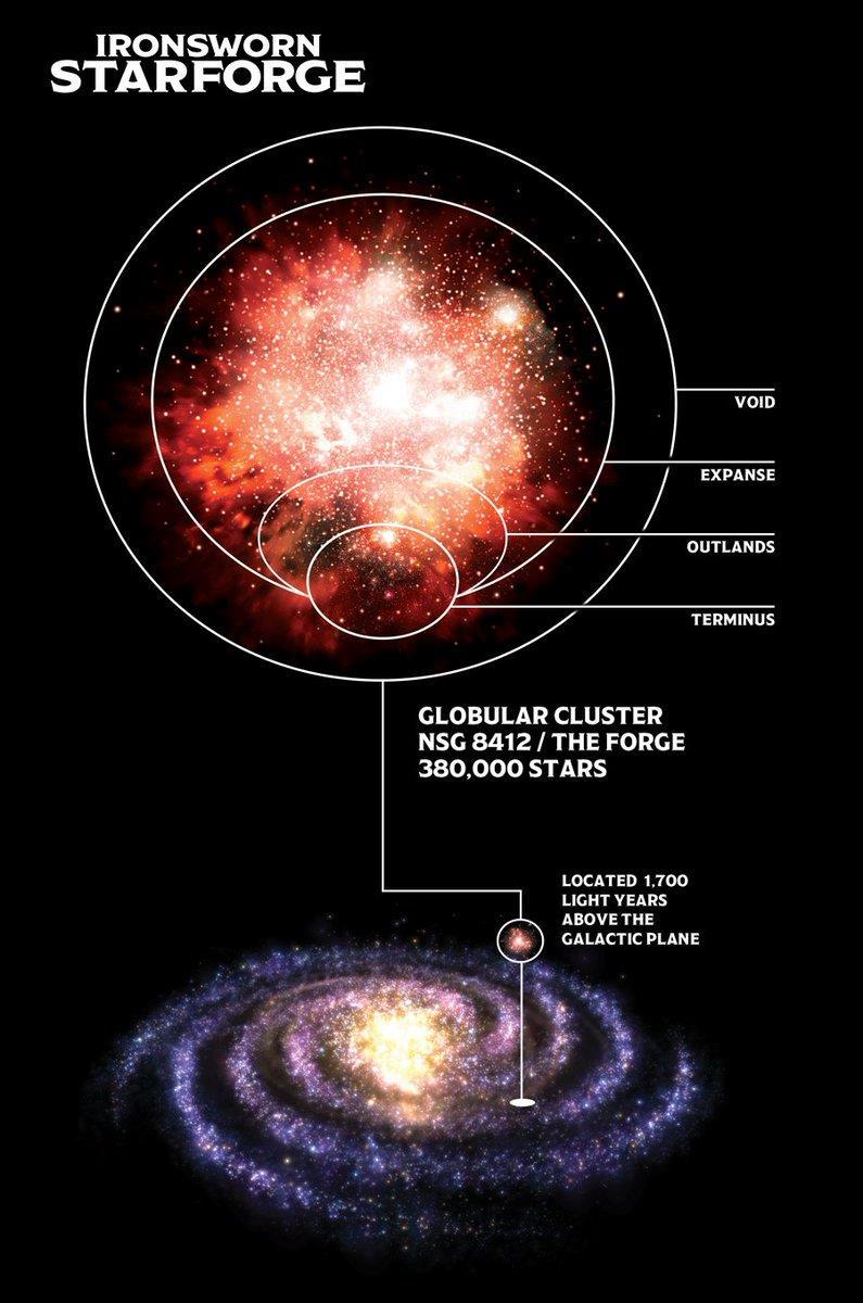 Итак, давным давно, (В книге пишут 200 лет назад, но мне кажется, гораздо больше), Поселенцы из наших краёв прибыли в Кузню, причём переселиться их заставил некий катаклизм (определяется при формировании сеттинга) в их собственной галактике. Кузня (The Forge), это шаровое скопление, находящееся в 1700 световых годах над галактической плоскостью — яркий остров в темной пустоте.