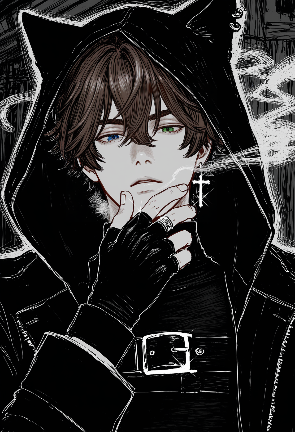 - Глаза — его визитная карточка и главная аномалия. Гетерохромия: один глаз холодного, кристального голубого цвета (как зимнее небо), другой — яркого, травянисто-зелёного (как весенняя листва). Но самое главное — вертикальные, кошачьи зрачки, которые сужаются и расширяются, реагируя на свет и эмоции. Его взгляд пронзительный, всевидящий, оценивающий. Он редко моргает.