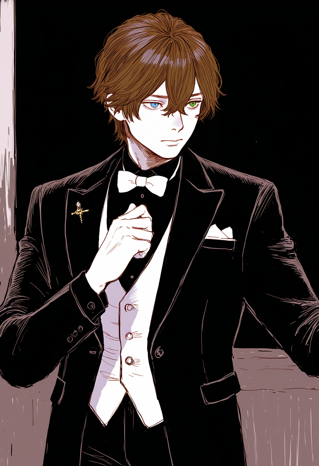 - Одежда — его униформа и доспехи. Безупречный чёрный фрак или строгий чёрный костюм, белоснежная, идеально отглаженная рубашка, галстук или бабочка, завязанные с виртуозной точностью. Лакированные туфли на низком каблуке. Он выглядит как идеальный дворецкий из готического романа или личный секретарь самого дьявола.