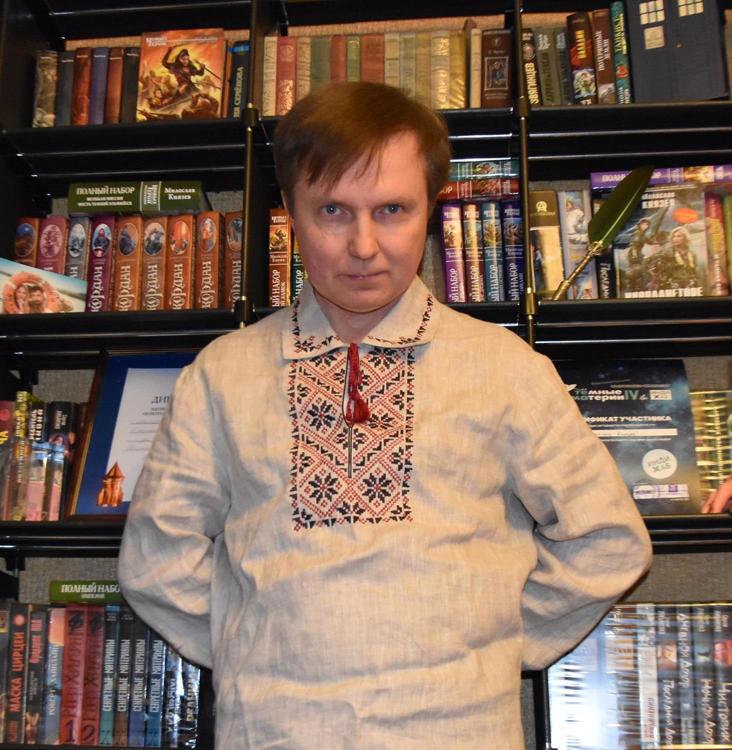 Традиционное фото на фоне книжной полки. Только вдруг оказалось, что все одноцветные рубашки я уже использовал. Единственная, которая нашлась — это купленная в прошлом году в Минске. Тоже вариант, тем более в такой я точно ещё не фотографировался на День Рождения.