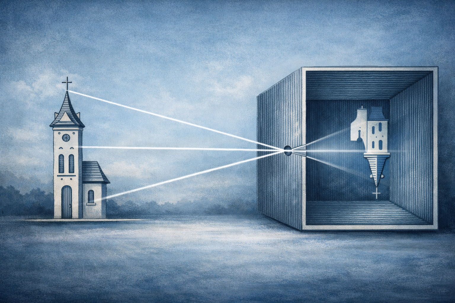 По сути, это тёмное пространство с маленьким отверстием, в которое попадает пучок света, и на противоположной поверхности появляется изображение внешнего мира. Перевёрнутое, иногда немного искажённое, но при этом абсолютно узнаваемое.