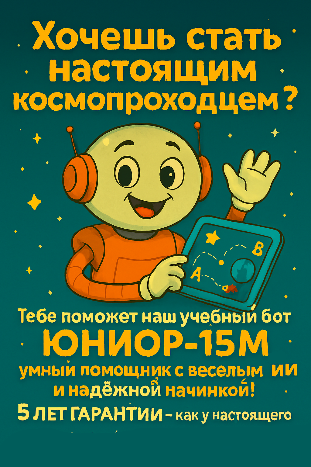 Хочешь стать настоящим космопроходцем? Тебе поможет наш учебный бот Юниор‑15М — умный помощник с весёлым ИИ и надёжной начинкой! Он умеет учить, играть и помогать в звёздных приключениях. А ещё у него целых 5 лет гарантии — как у настоящего исследовательского бота!