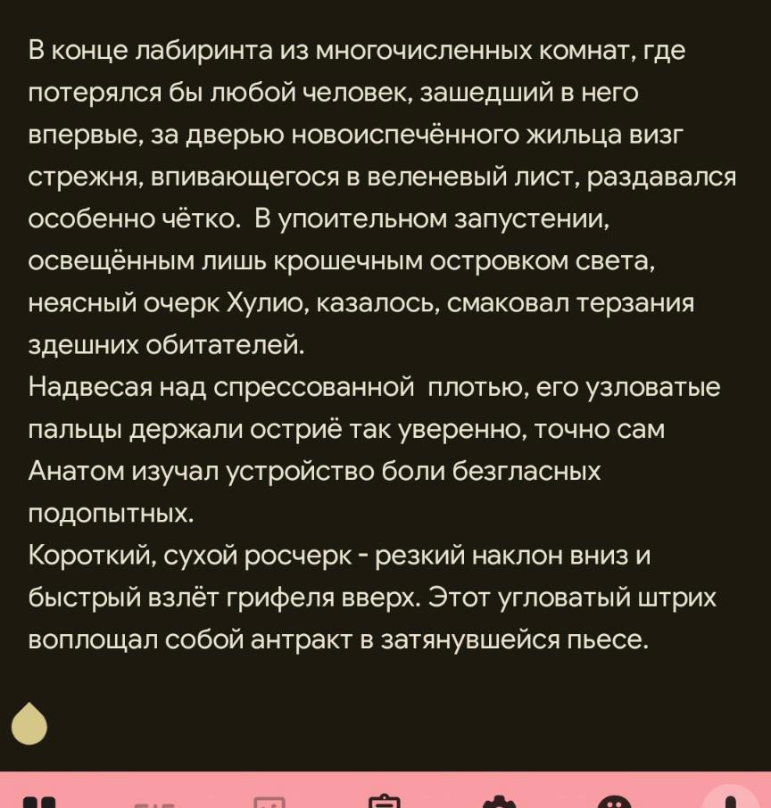 Я не боюсь сложного слога. Наоборот, я нахожу в нем особую честность. На скриншоте — момент, где стиль письма отражает характер героя: его узловатые пальцы, его уверенность, его готовность превратить лист бумаги в операционный стол.