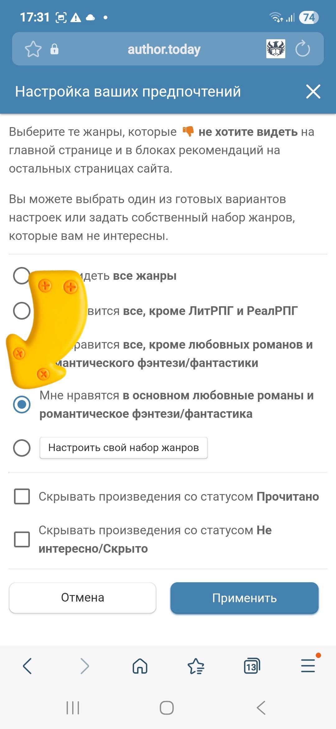 Пользуйтесь на здоровье! Теперь ваша Главная Страница АТ будет наполняться не просто интересными книгами, а теми самыми, которые вы искали, сами того толком не зная. Приятного чтения, полного нужного градуса!