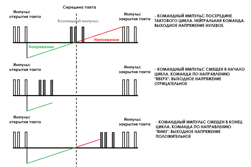 По положению командного сигнала относительно середины тактового цикла ракета понимает – в какую сторону ей отвернуть. А вот конкретная величина необходимого маневра (т.е. до какой степени ракете необходимо повернуть рули в том или ином направлении) зависит от того, насколько именно командный сигнал смещен относительно середины цикла.